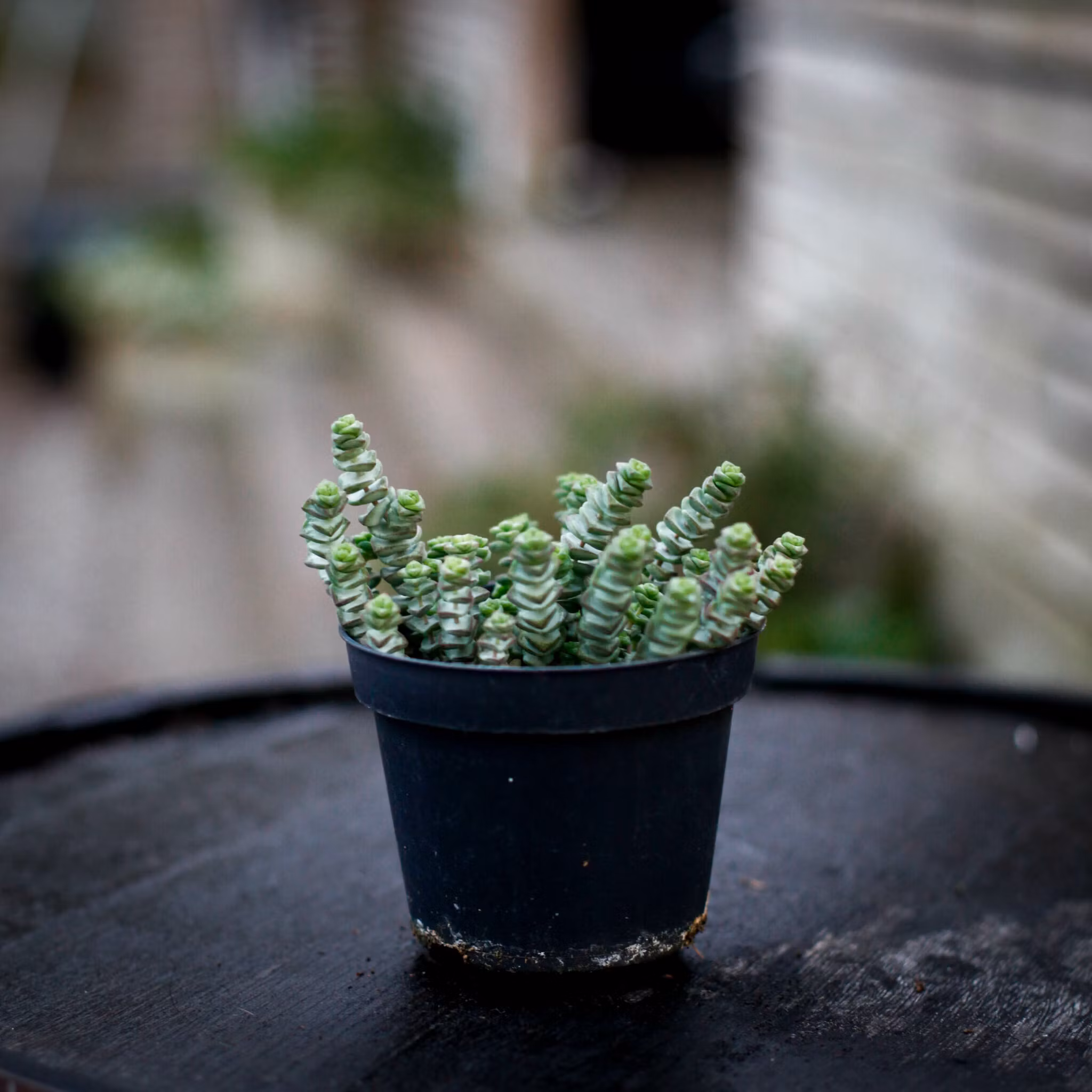Crassula marnieriana, 8,5 cm: En kompakt, lättskött suckulent med grågröna blad och röda kanter. Perfekt för soliga fönster och små utrymmen. Vattna sparsamt.