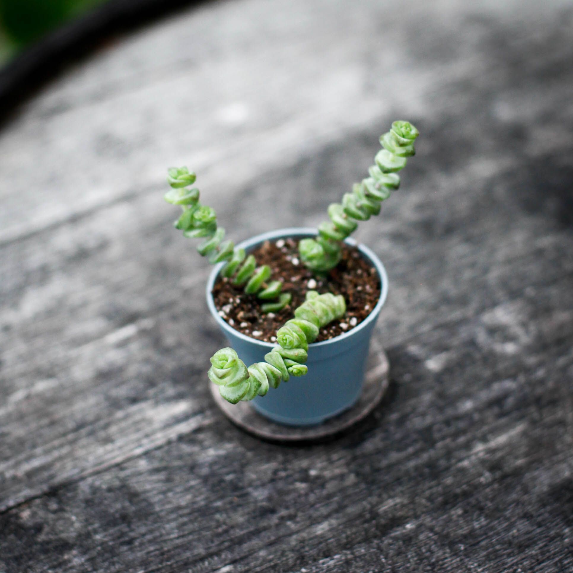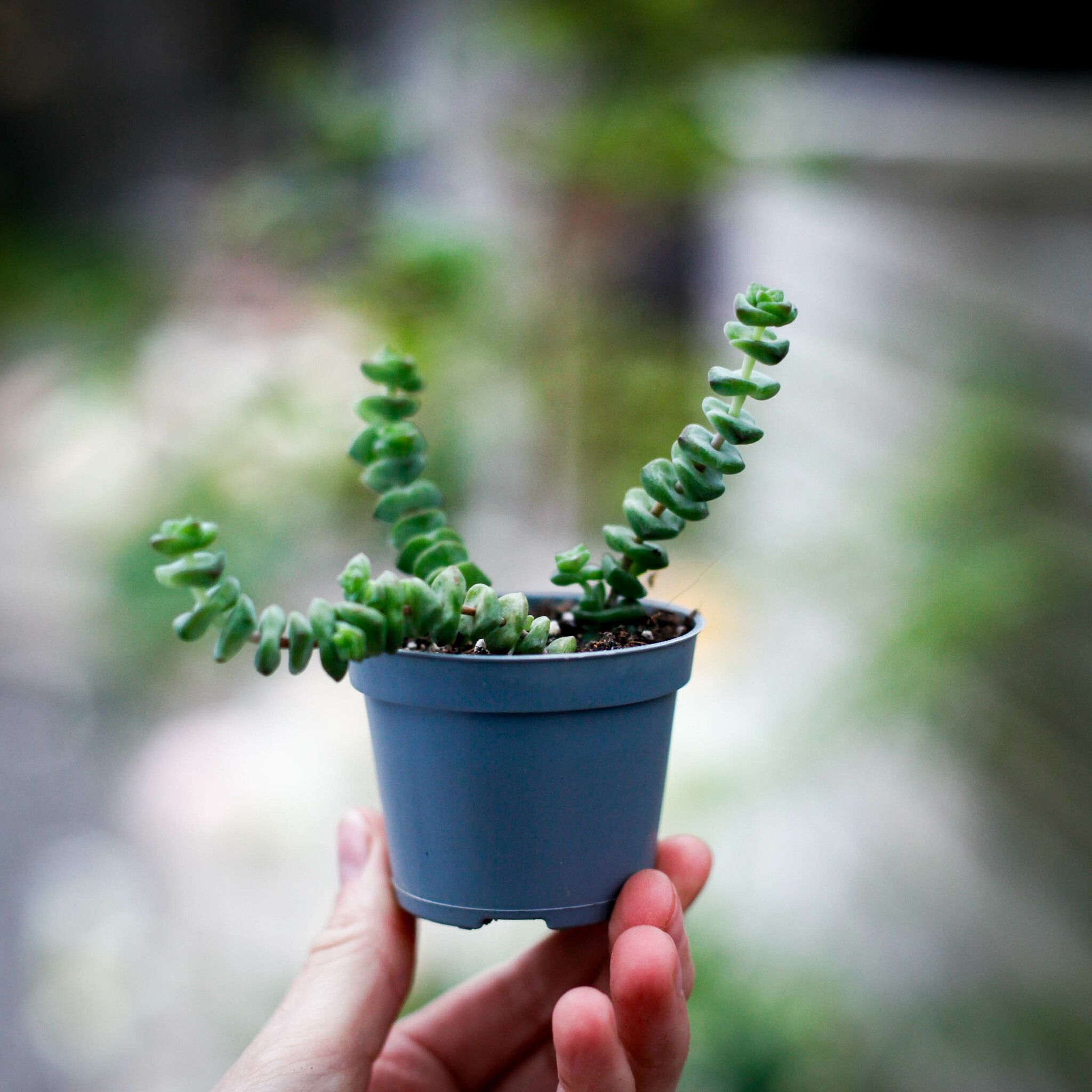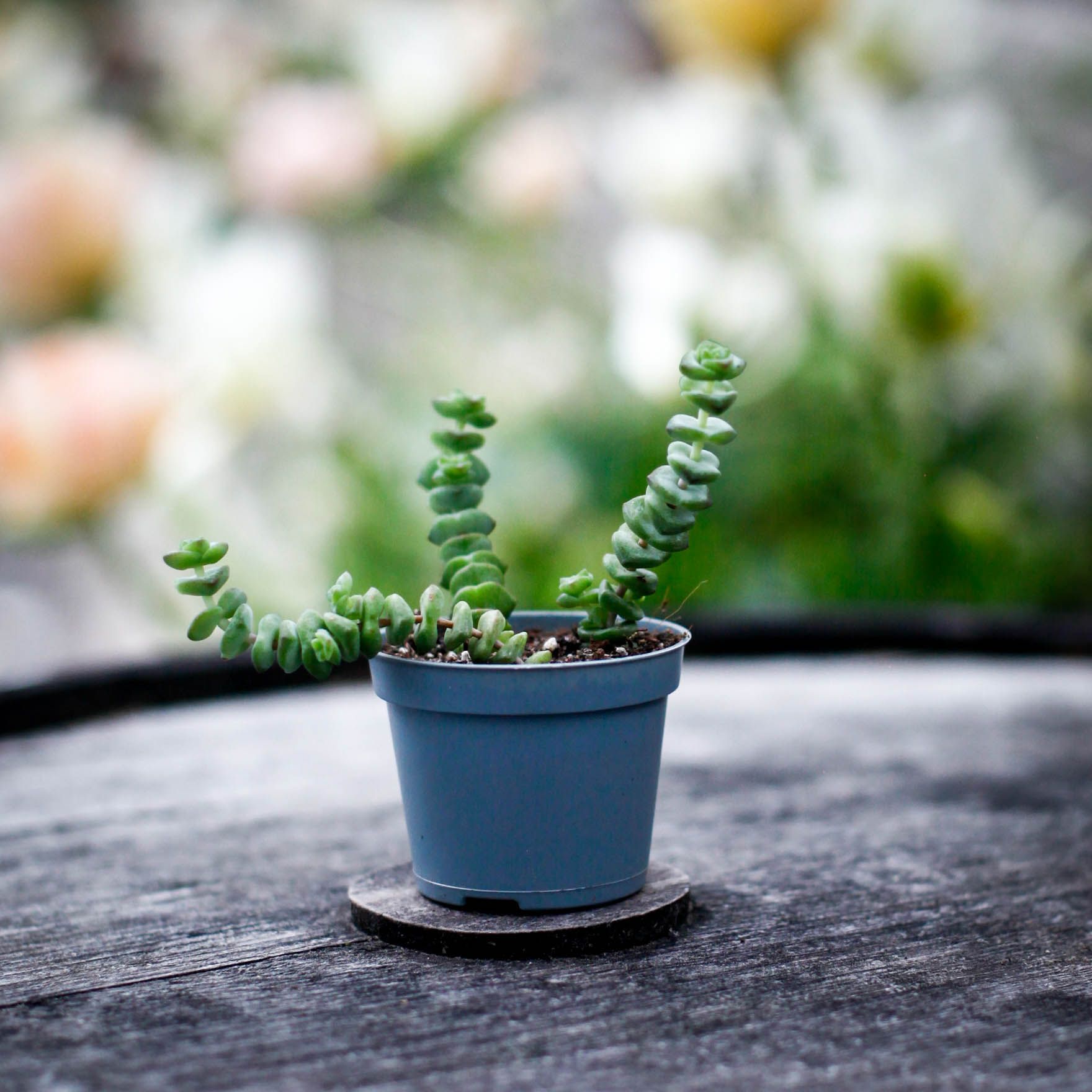 Crassula marnieriana 6 cm, "Trollhalsband," är en unik och lättskött växt med staplade blad. Perfekt för moderna hem. Köp hos Klorofyllverket.se.