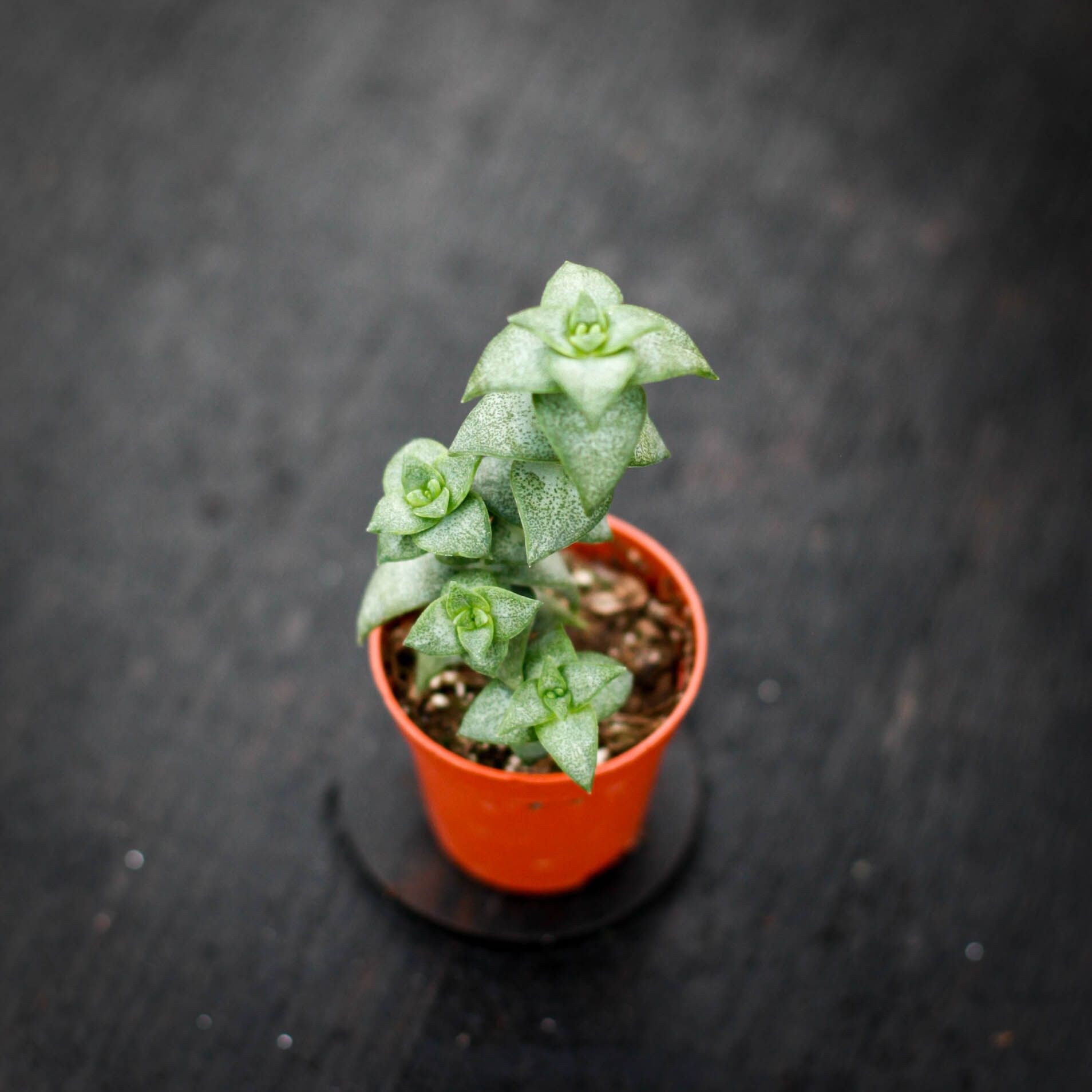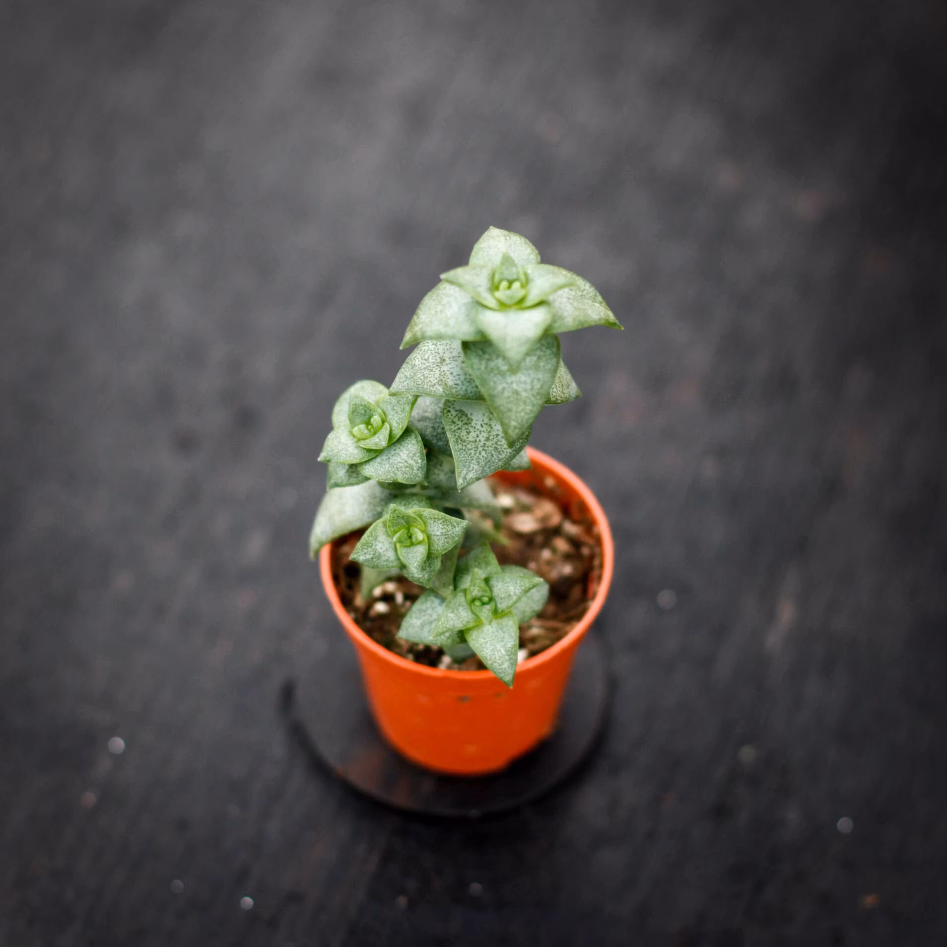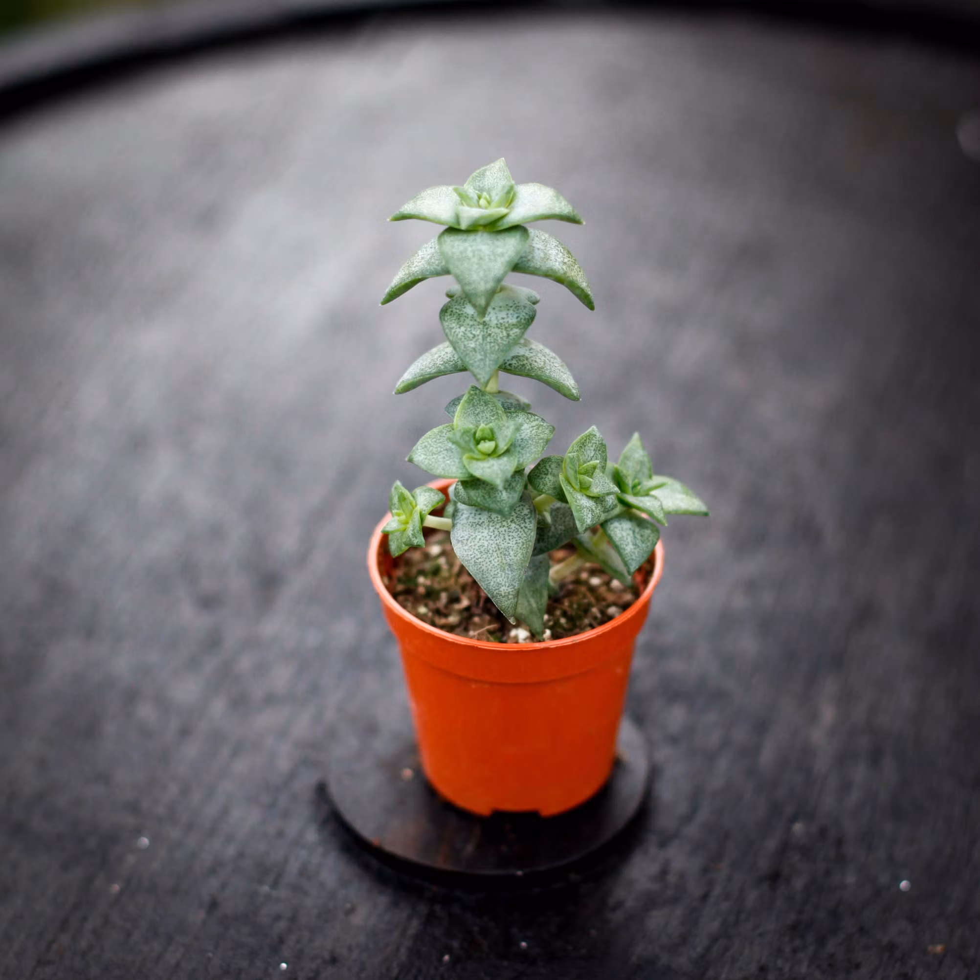 Crassula perforata 6 cm, även känd som "Halsbandskaktus", är en unik suckulent med spiralformade blad. Perfekt för amplar, kräver minimal skötsel.