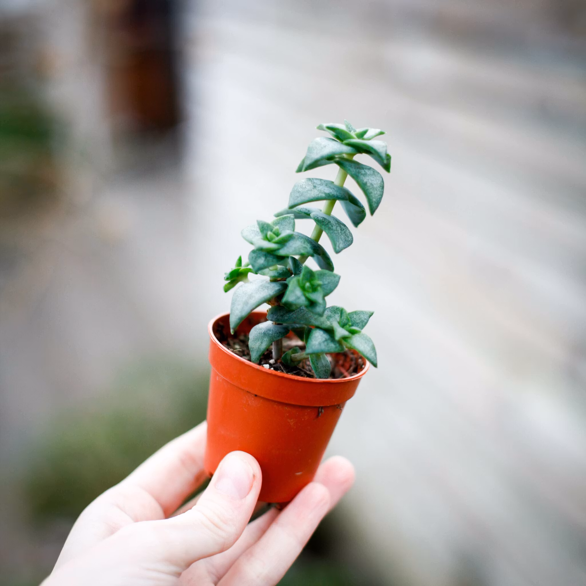 Crassula perforata, även känd som "Strängar av knappar" eller "Halsbandskaktus", är en fascinerande suckulent med ett unikt utseende. Växten bildar långa, slingrande stammar med små, triangulära blad som växer i en spiral runt stjälken och liknar små pärlor trädda på ett snöre.