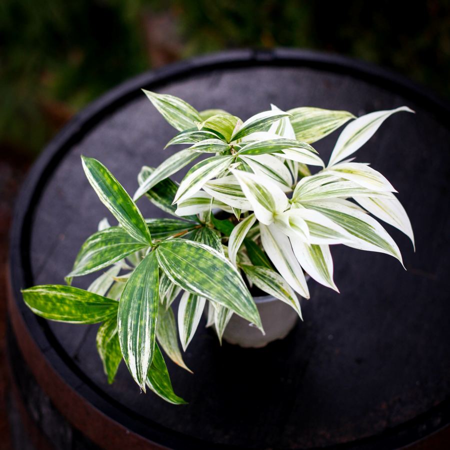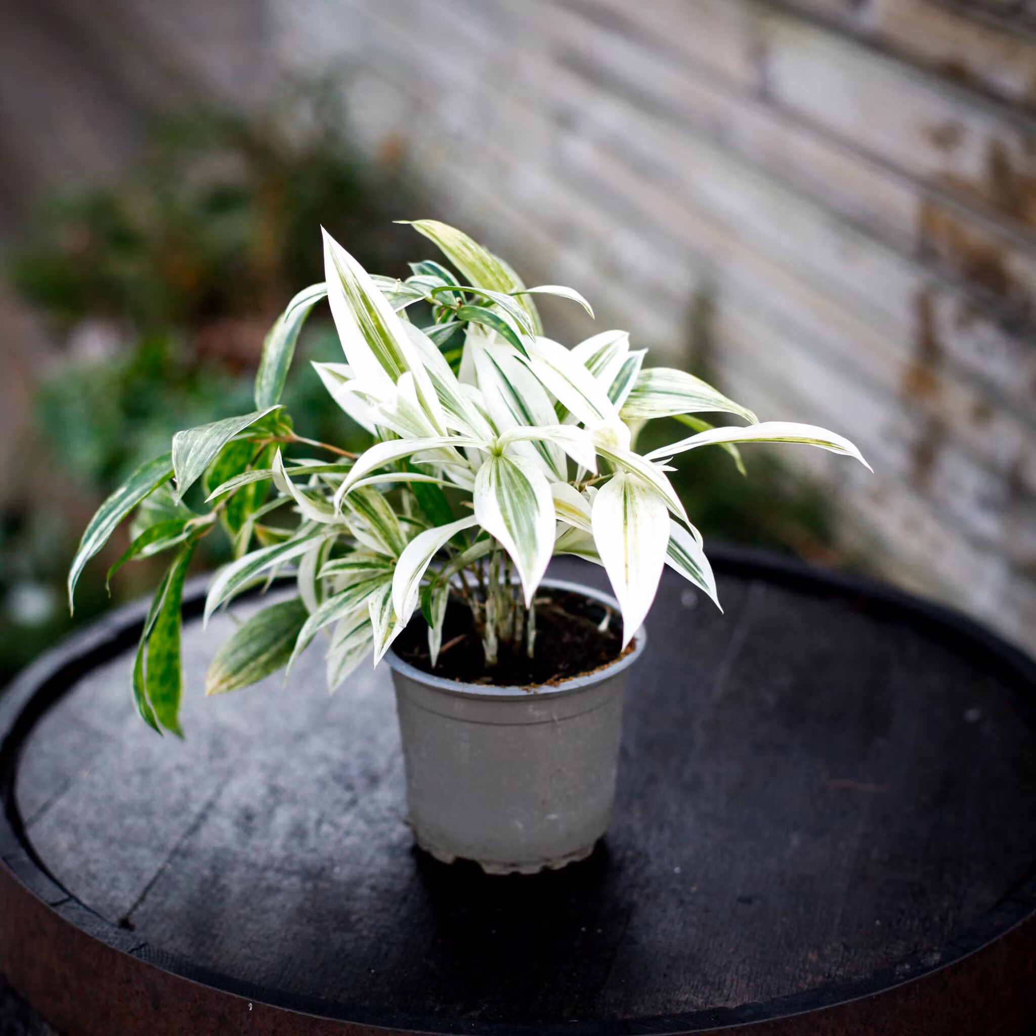 Dracaena 'Mike White' är en sällsynt och fascinerande växt som ser ut att ha fått sina blad stänkmålade med ljusa färger. Vissa blad är djupt gröna med prickar, medan andra har en ljusare, nästan vit ton. Variationerna gör varje planta unik och eftertraktad!