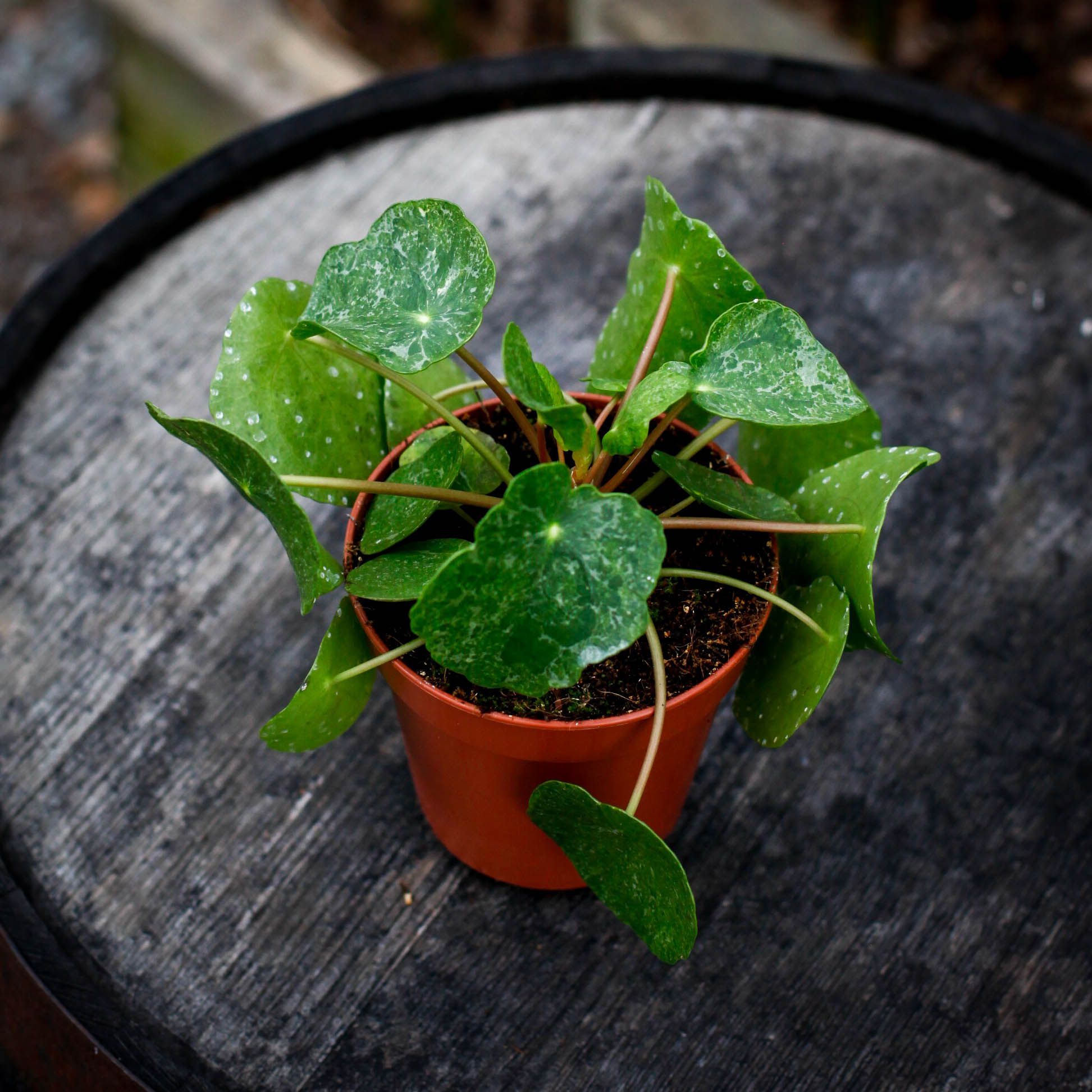 Pilea Peperomioides 'Sugar' – unik elefantöra med skimrande blad. Perfekt för stilfull inredning och enkel skötsel. Köp hos Klorofyllverket.