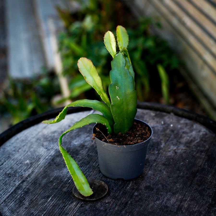 Epiphyllum ackermanii är en unik bladkaktus med stora, röda blommor. Perfekt för skuggiga rum, den trivs i fukt och indirekt ljus. Köp hos Klorofyllverket.se!