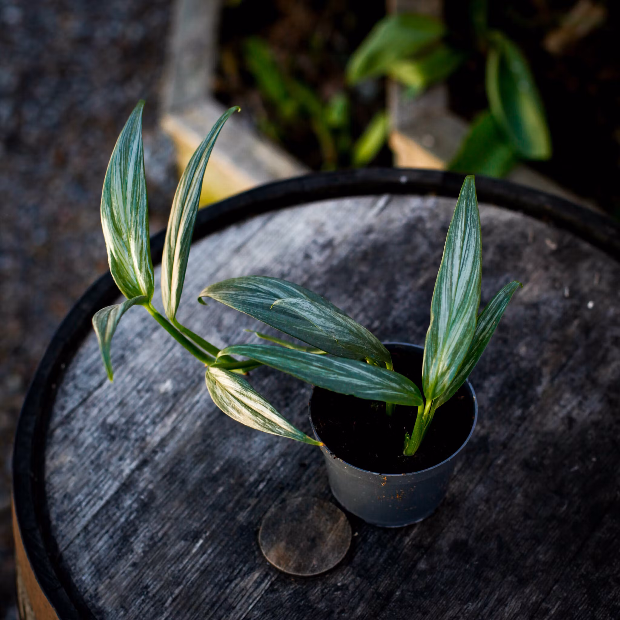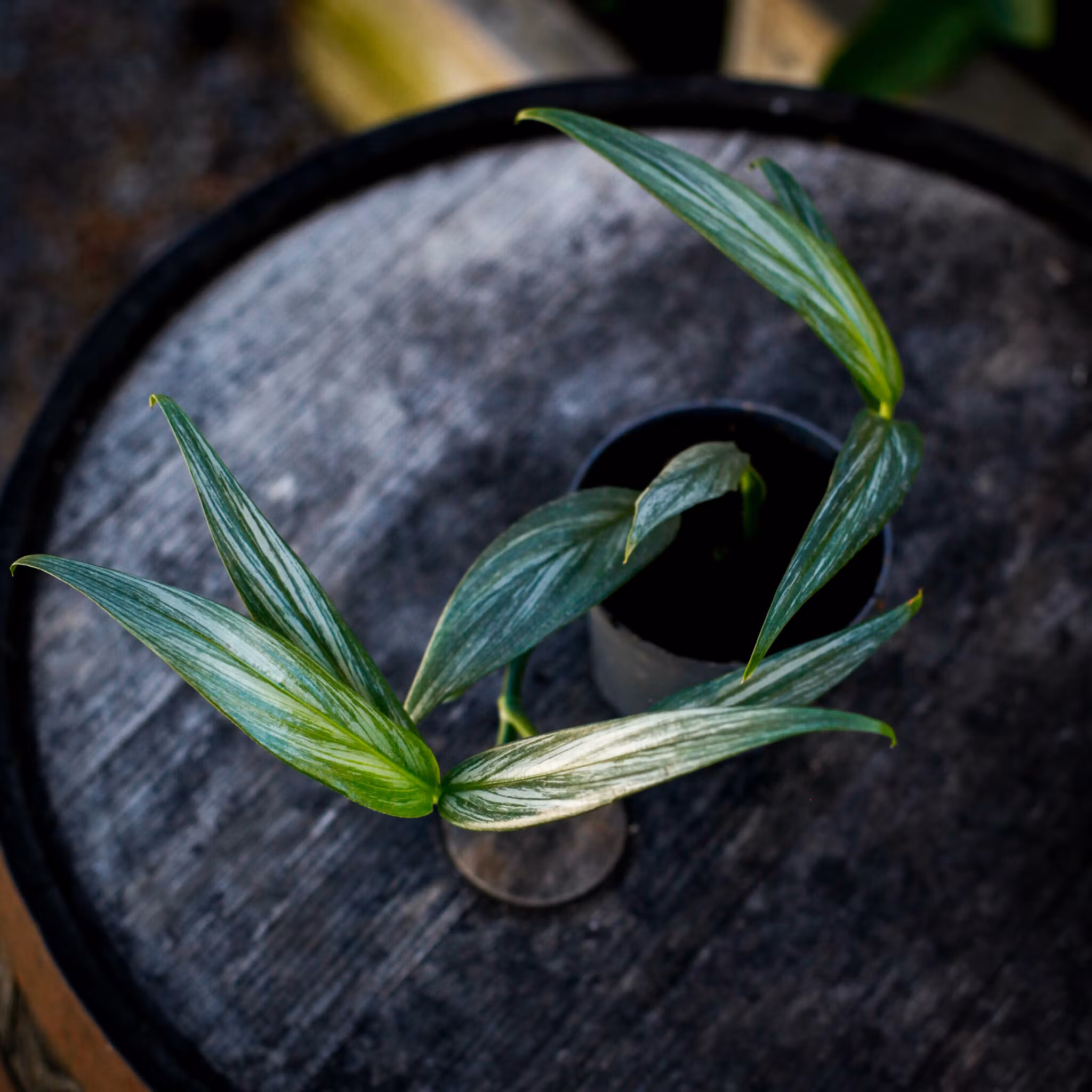 Epipremnum amplissimum 'Silver Stripe' tillhör samma släkte som den populära Gullrankan (Epipremnum aureum), men har ett mer elegant och smalt bladverk. Dess silvriga strimmor blir tydligare i starkt, indirekt ljus, vilket gör den till en favorit bland samlare av ovanliga klätterväxter.