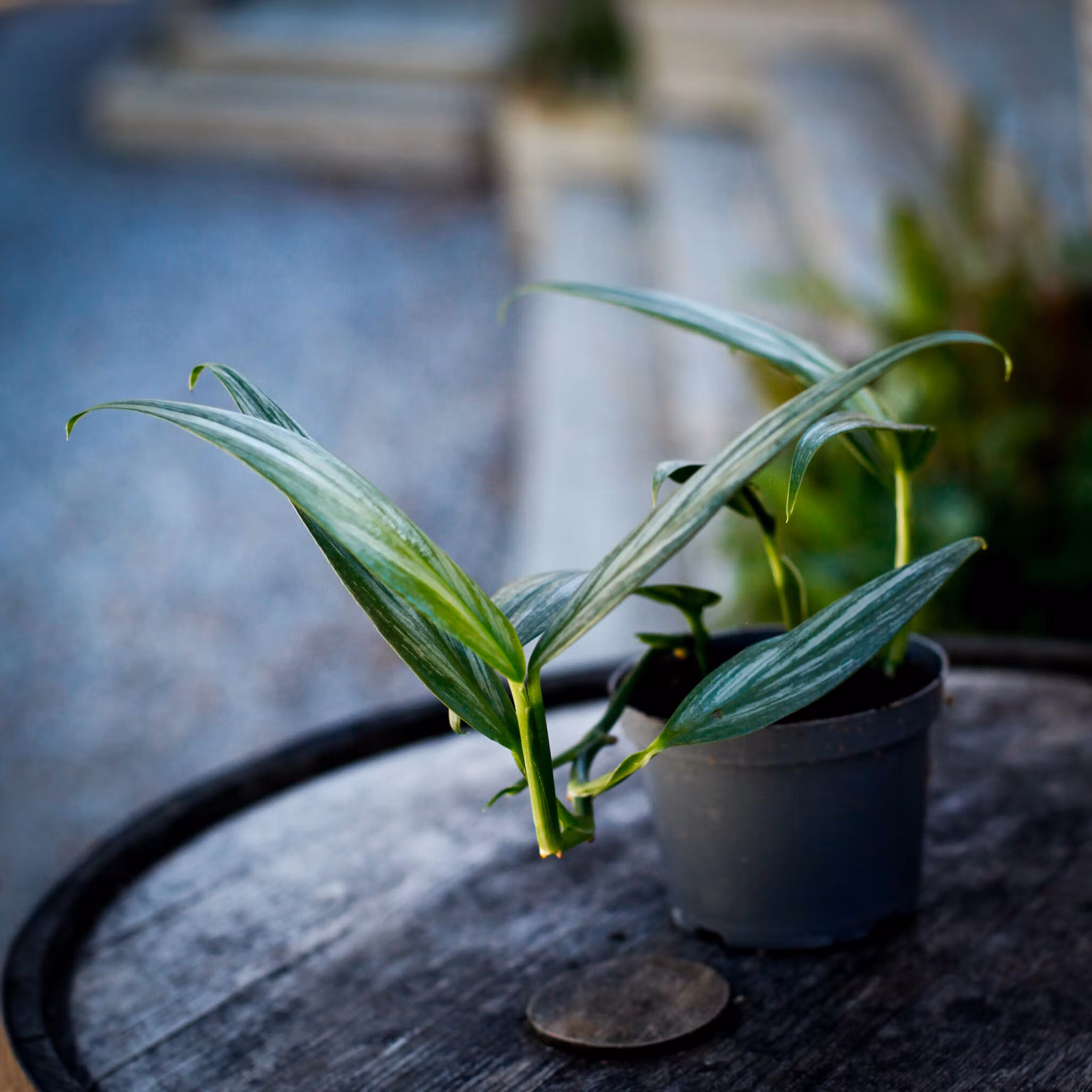 Epipremnum amplissimum 'Silver Stripe' är en unik och stilren klätterväxt med smala, lansettformade blad som har en vacker silveraktig variegering. Den är en ovanligare sort inom Epipremnum-familjen och uppskattas för sin eleganta framtoning och enkla skötsel. Perfekt för både upphängning i ampel eller låta den klättra upp längs en mossstång eller spaljé.