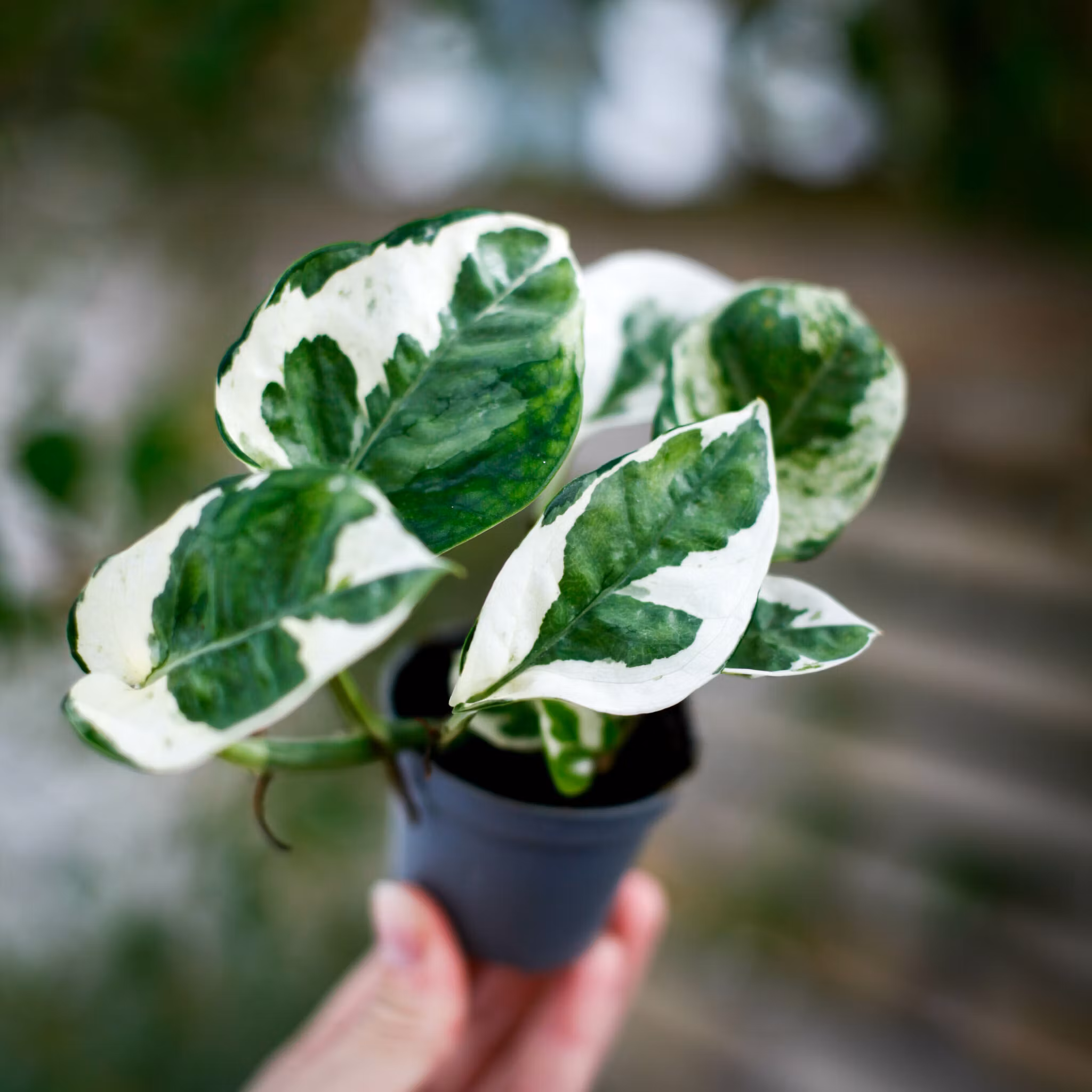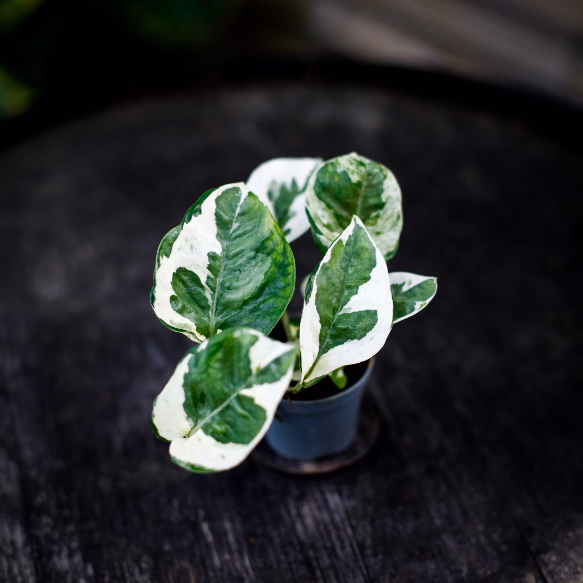 Epipremnum 'N'Joy' är en elegant och charmig klätterväxt som utmärker sig med sina vita och gröna blad som ger ett nästan marmorliknande utseende. De ljusa, krämfärgade inslagen i bladen skapar en fin kontrast mot den djupgröna basfärgen och ger växten ett fräscht och livfullt uttryck. Växten växer snabbt och kan klättra på ett stöd eller hänga fritt i en ampel, vilket gör den idealisk för både små och stora inomhusutrymmen.