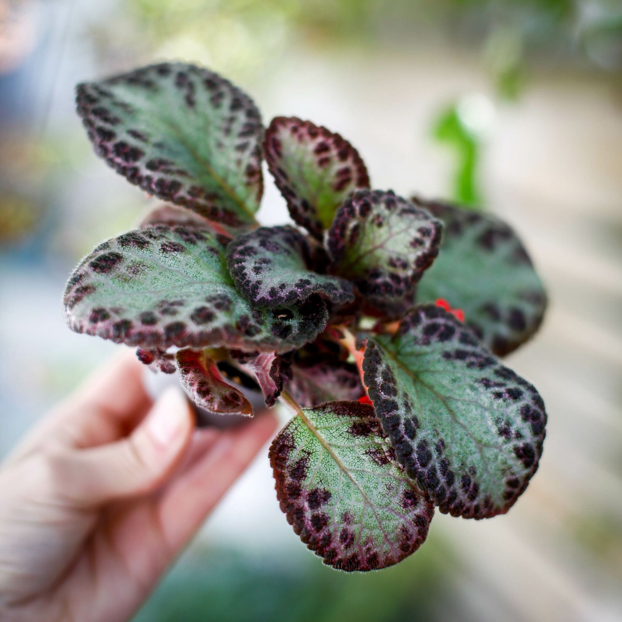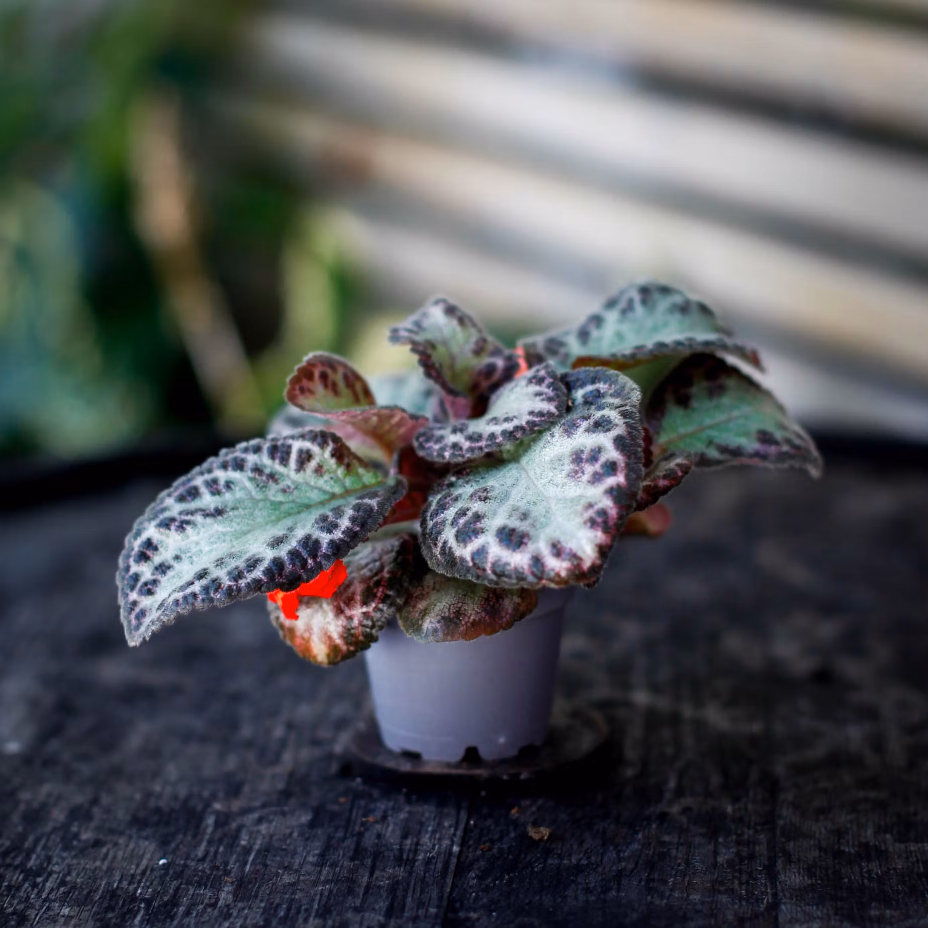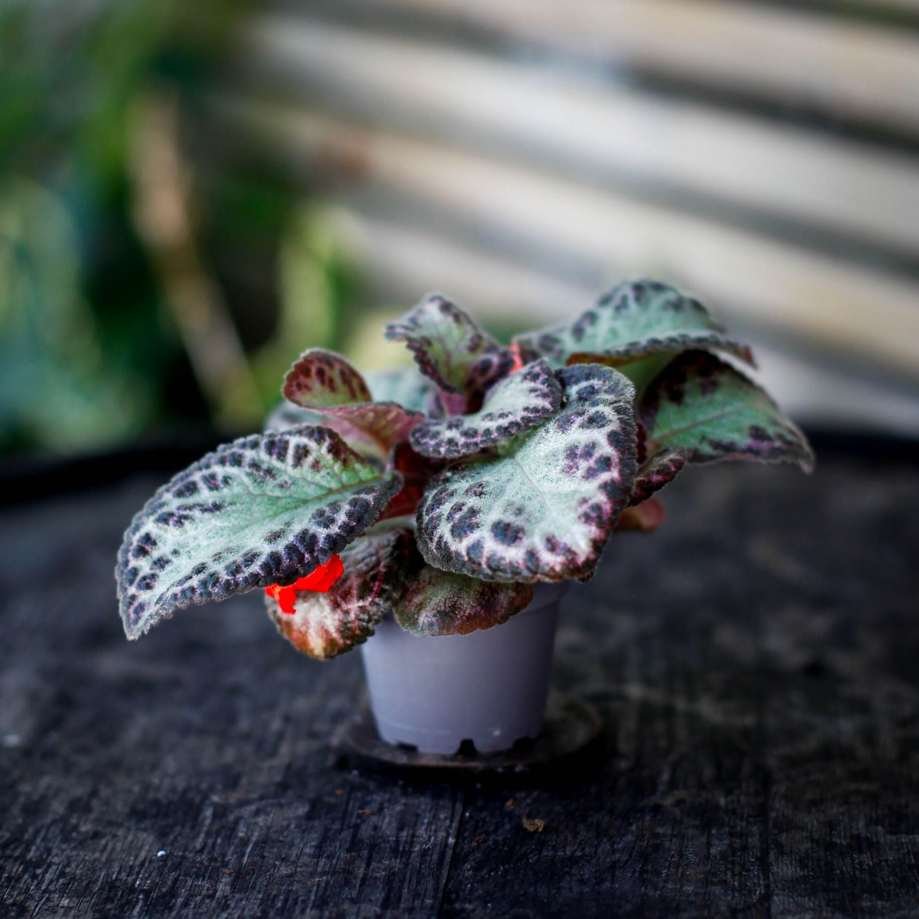 Episcia 'Pink Acajou'6 cm, är en lättskött inomhusväxt med färgglada blommor, idealisk för ljusa, indirekta ljusförhållanden. Perfekt för färg och elegans i dit
