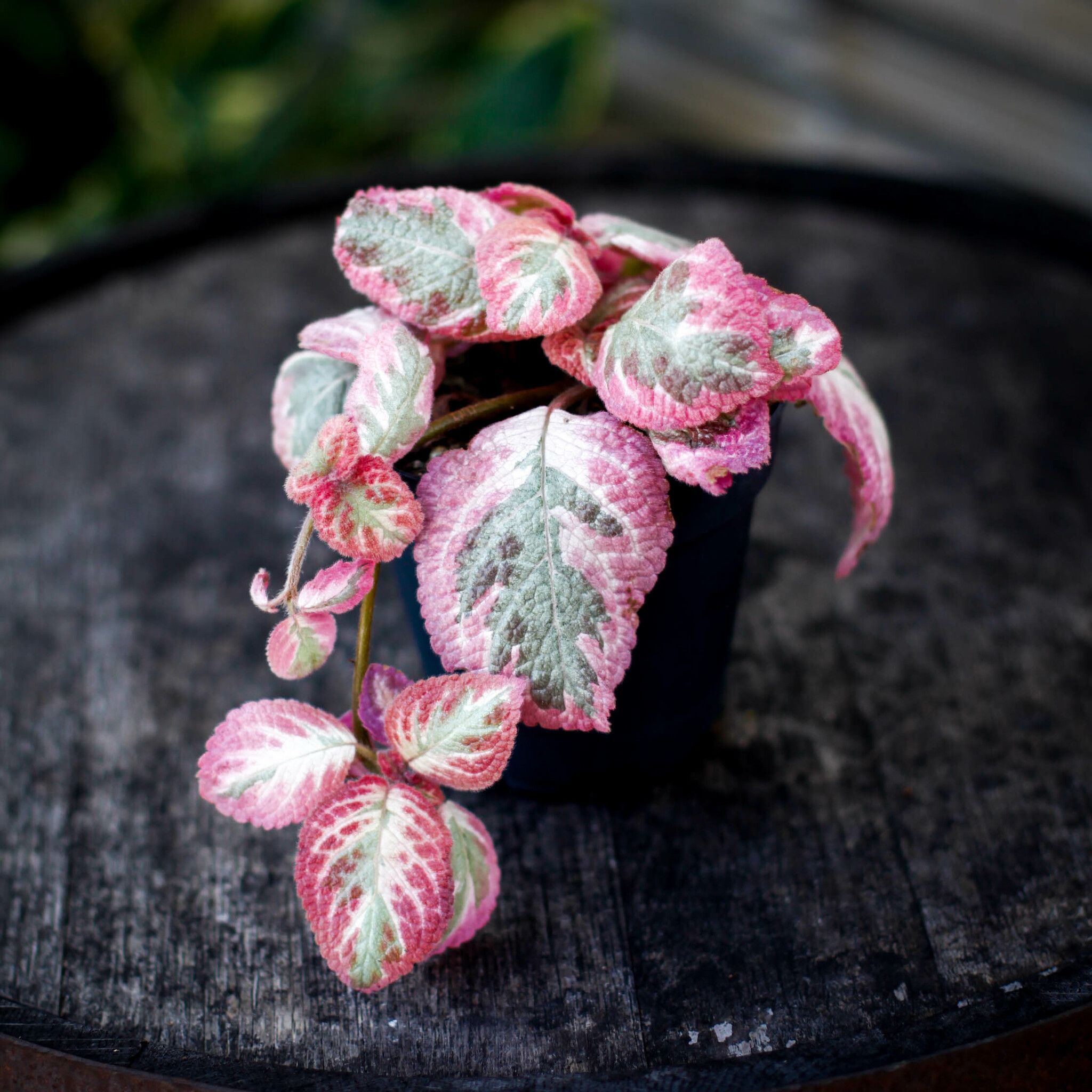 Episcia 'Pink Shimmering Valley' 12 cm, är en elegant krukväxt med rosa och silverblad. Perfekt för ljusa platser. Beställ hos Klorofyllverket.se idag.