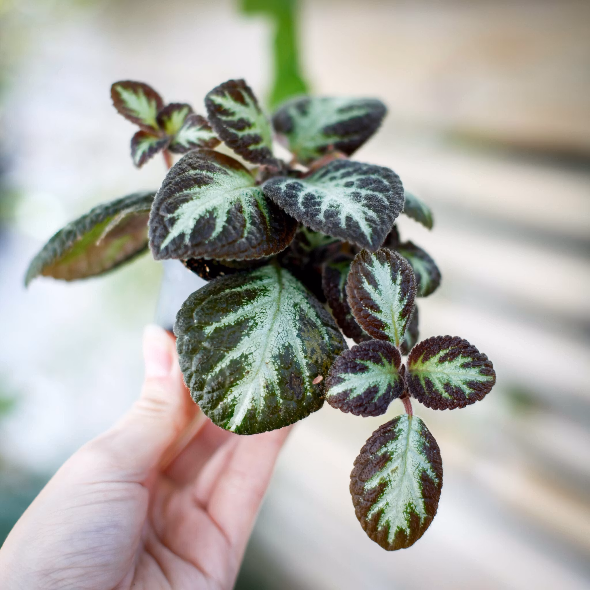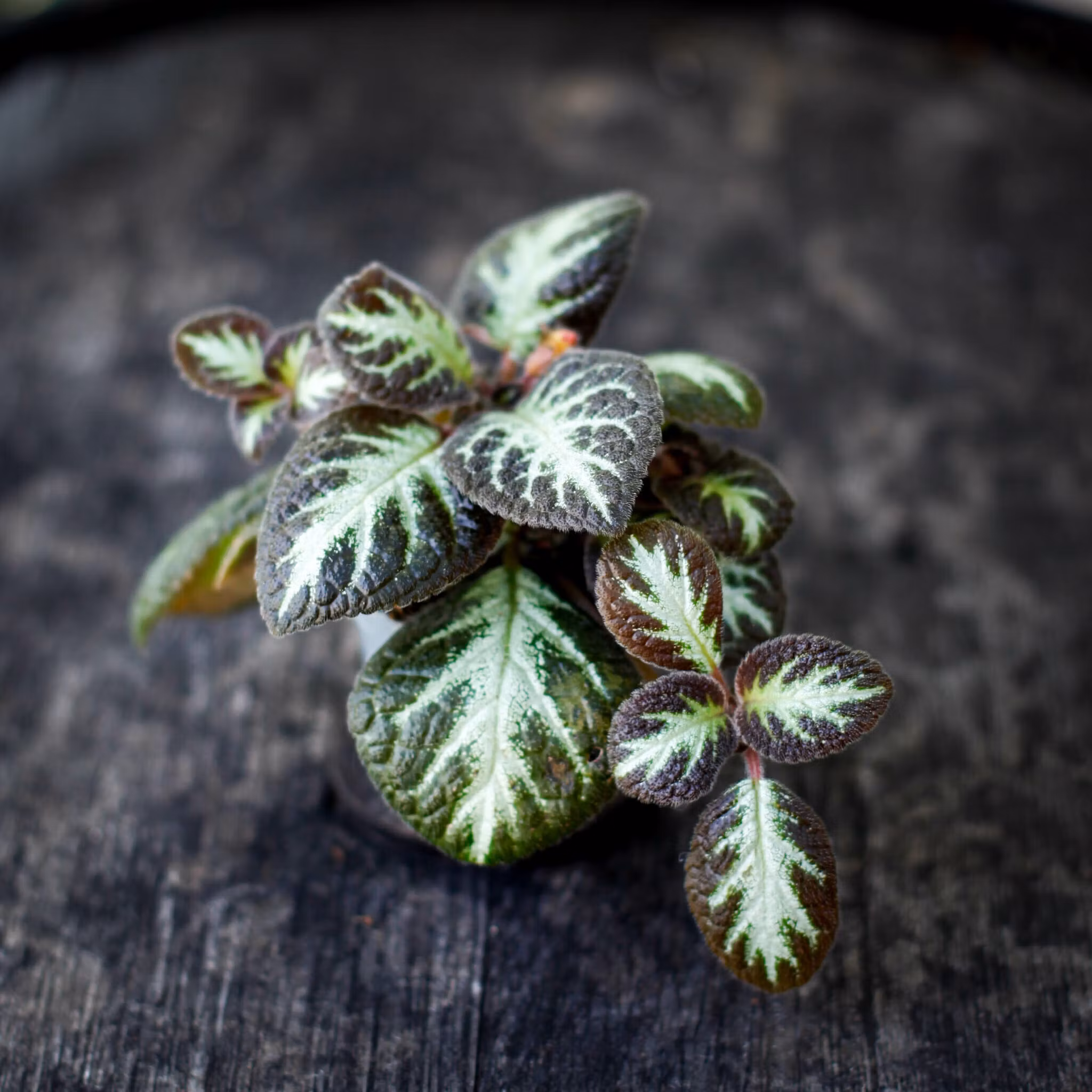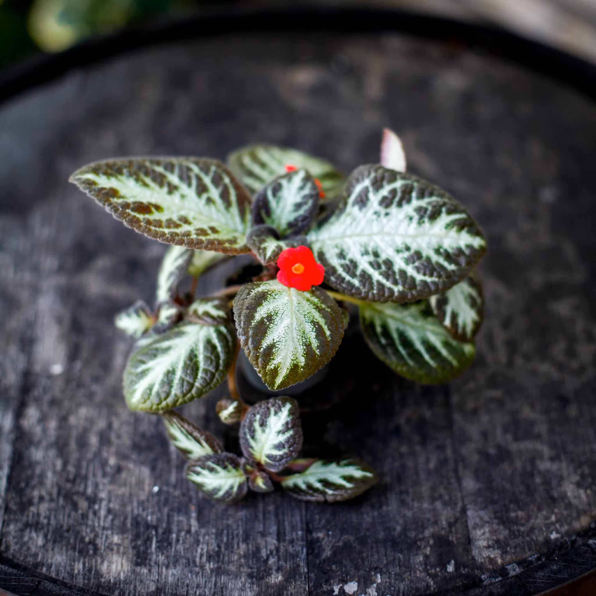 Episcia 'Silver Shield' 6 cm, är en lättskött inomhusväxt med dekorativa blad och färgglada blommor. Perfekt för ljusa, indirekta ljus och regelbunden vattning.