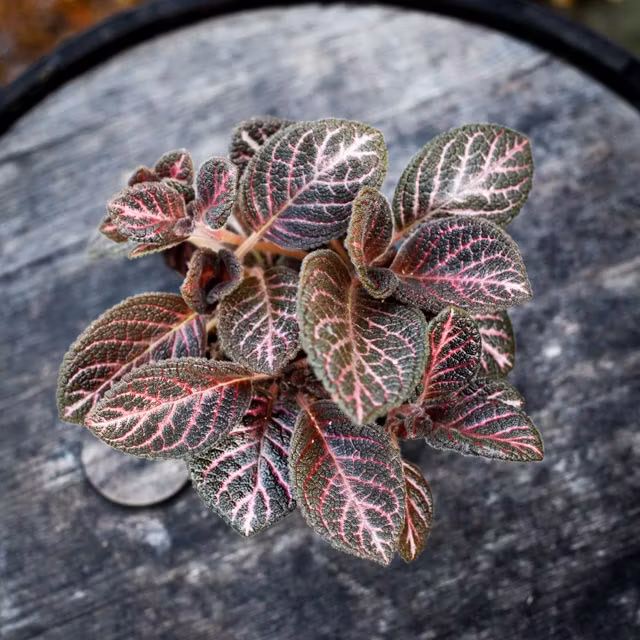 Episcia cupreata 'Tierra Noche', även kallad kopparblad, är en lågväxande växt med sammetslena blad och intensiva blommor. Perfekt för ljusa, fuktiga miljöer.