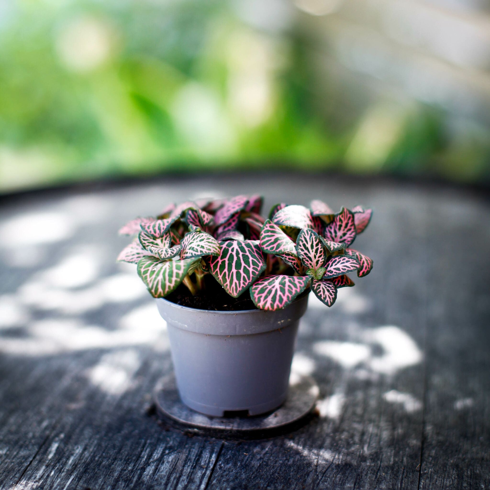 Upptäck Fittonia 'Red Angel Pink' 6 cm - livfull åderblad som lyser upp ditt hem. Perfekt för terrarier och lättskött. Köp nu på Klorofyllverket!