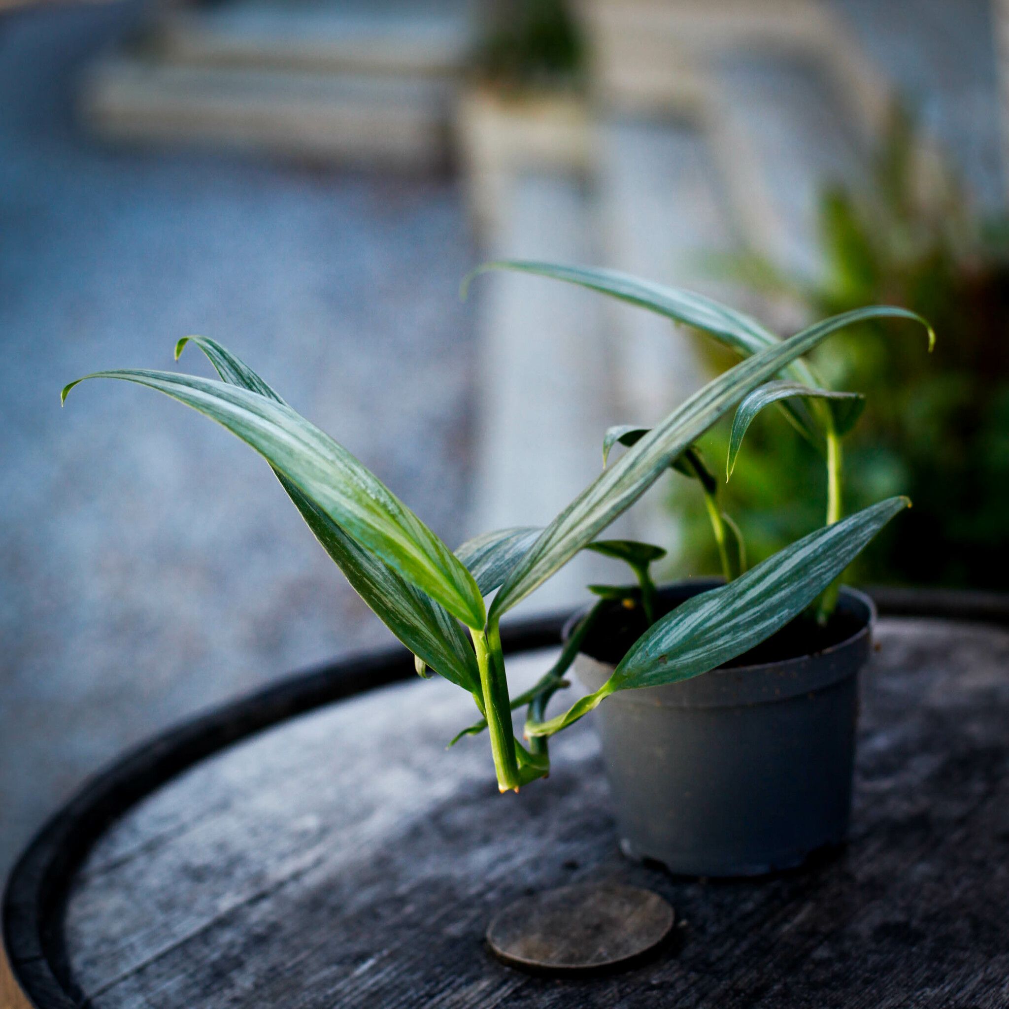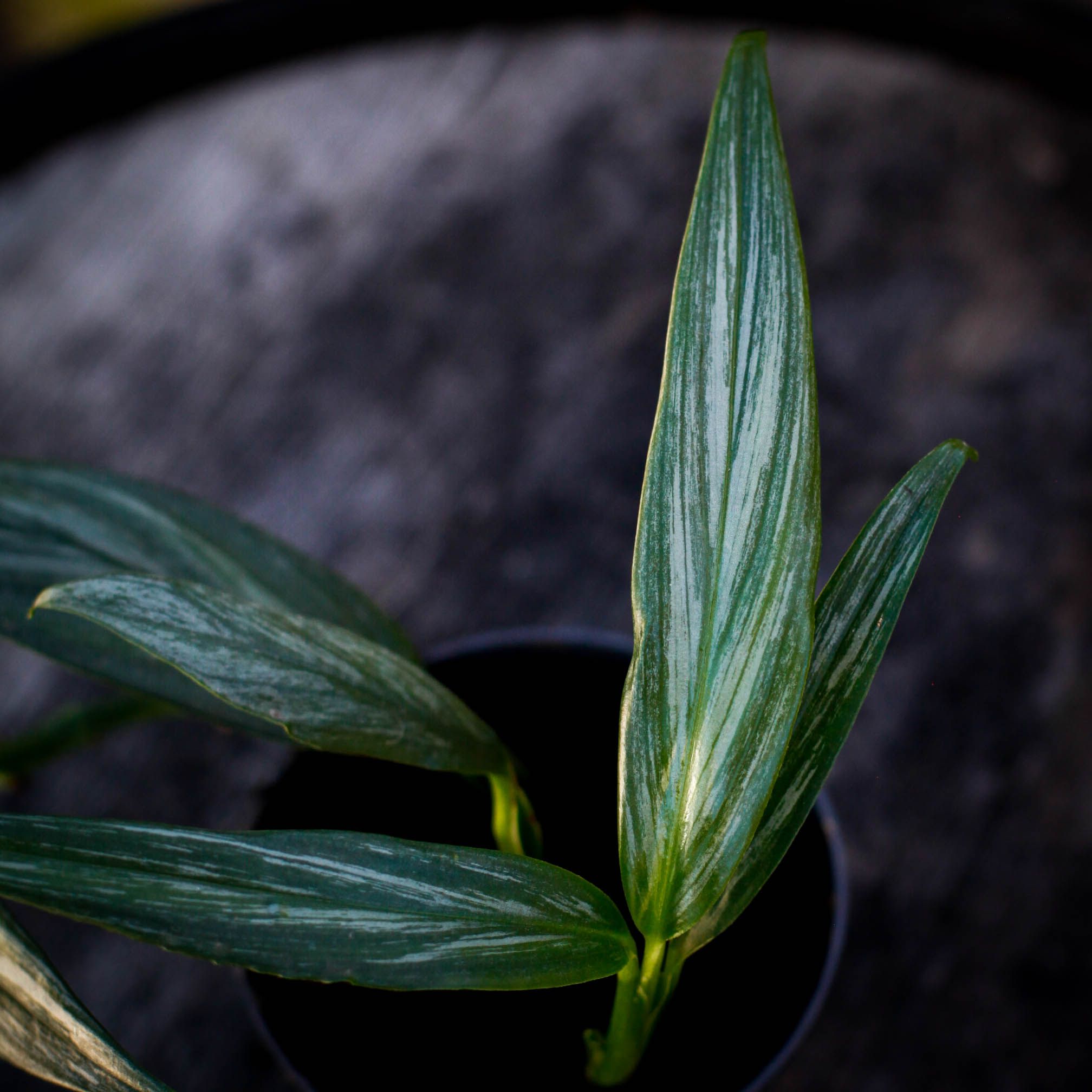 Epipremnum amplissimum 'Silver Stripe' tillhör samma släkte som den populära Gullrankan (Epipremnum aureum), men har ett mer elegant och smalt bladverk. Dess silvriga strimmor blir tydligare i starkt, indirekt ljus, vilket gör den till en favorit bland samlare av ovanliga klätterväxter.