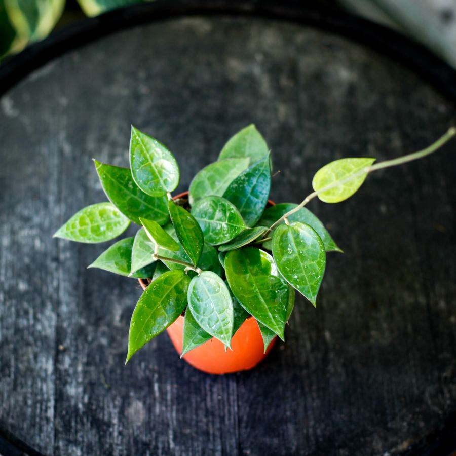 Hoya Parasitica Black Edge är en stilren porslinsblomma med mörka kanter och gröna blad. Trivs i ljusa, indirekta ljusförhållanden.12 cm kruka.