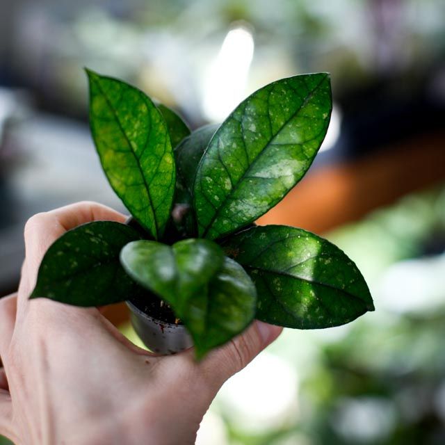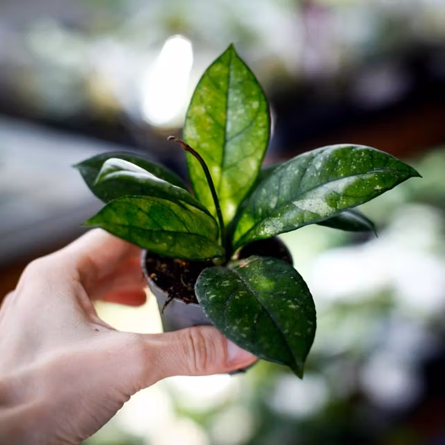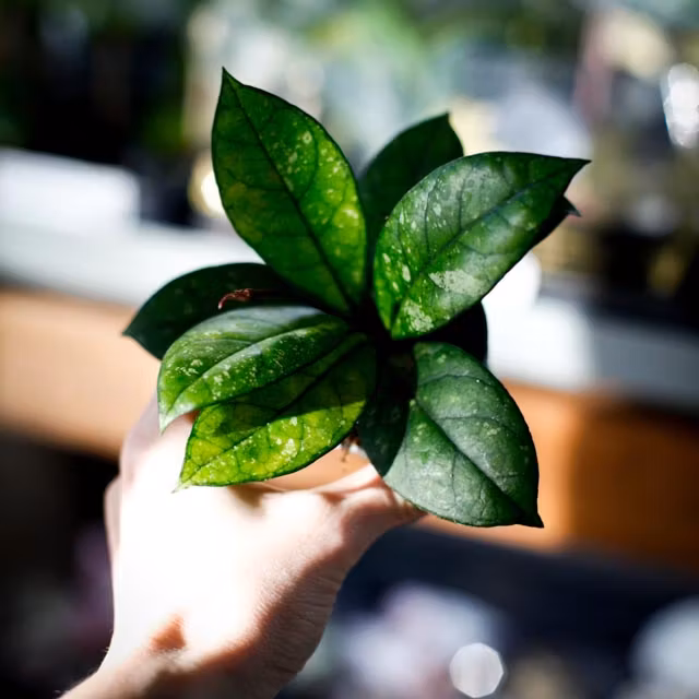 Hoya callistophylla 'Sabah' är en unik porslinsblomma från Borneo med grafiska, mörkgröna blad. Perfekt för ljusa platser och luftig jord.