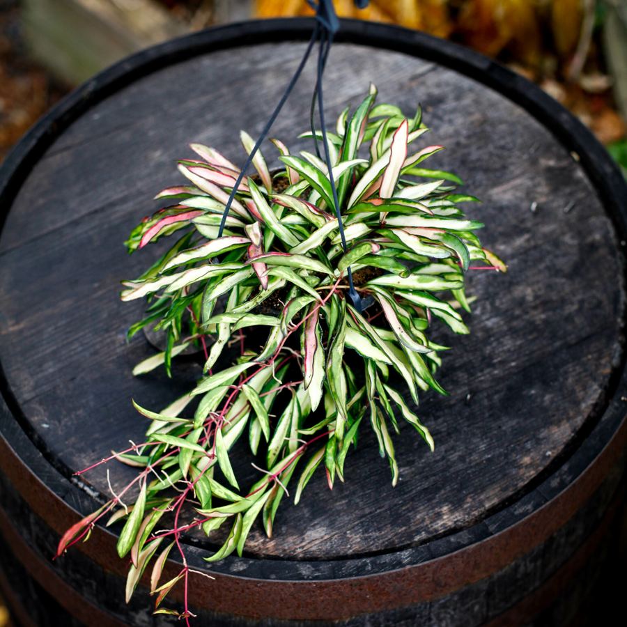Hoya wayetii 'Variegata' i ampel: En lättskött tropisk porslinsblomma med vackra, vaxartade blad i grönt och rosa. Perfekt för både hängande och klättrande deko