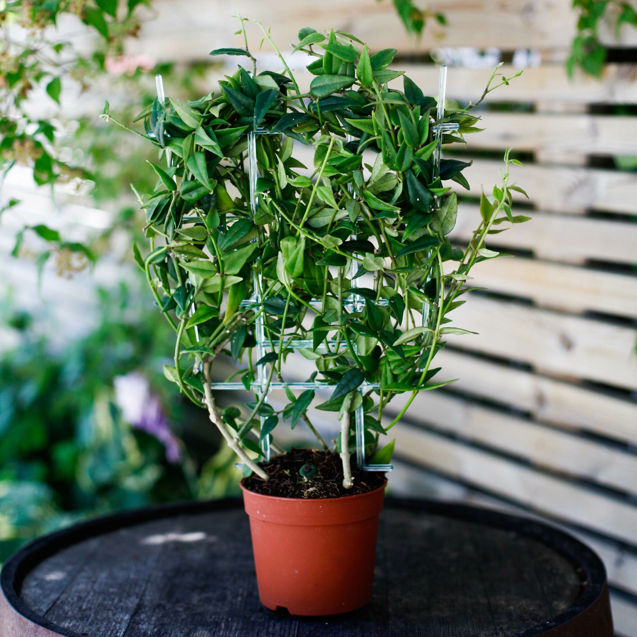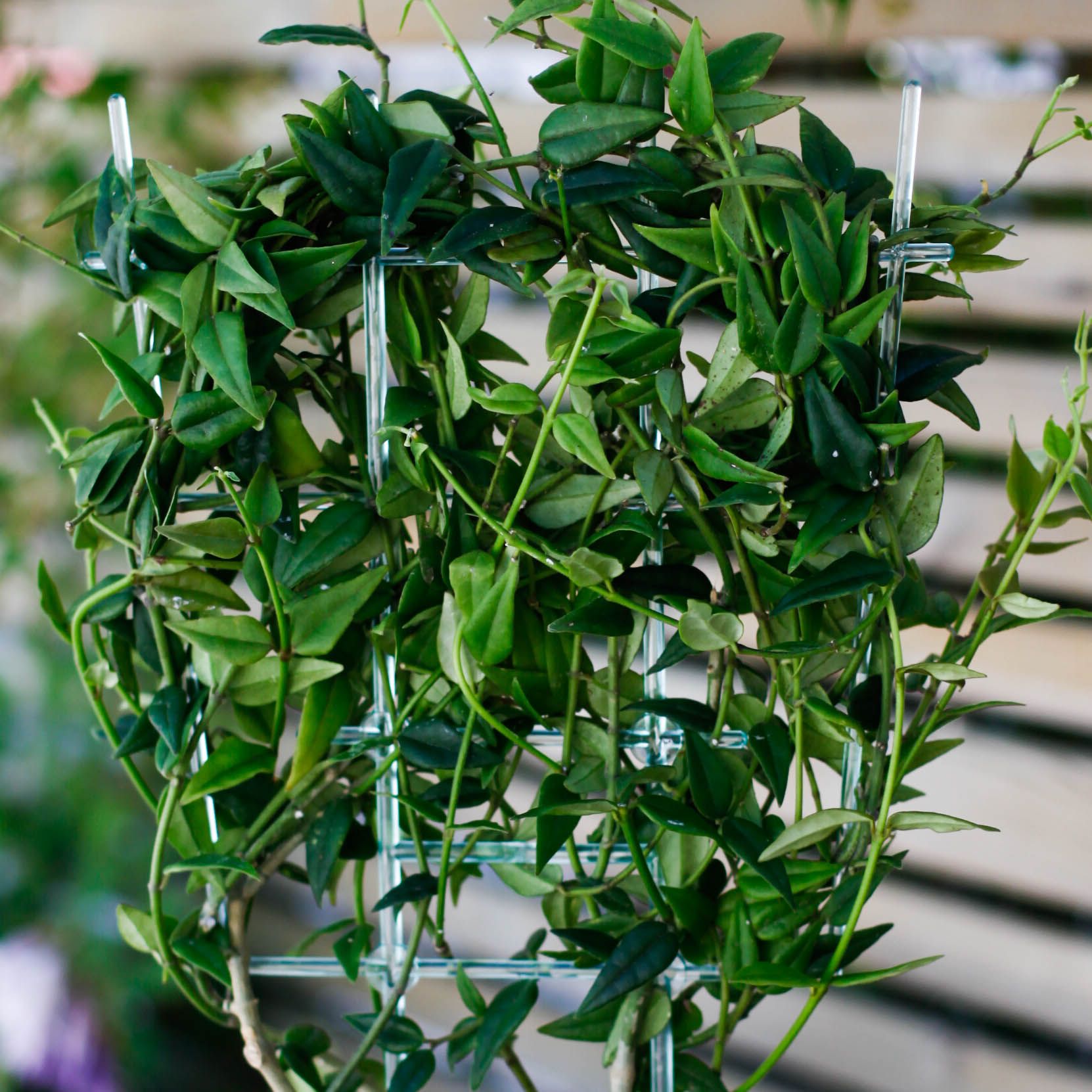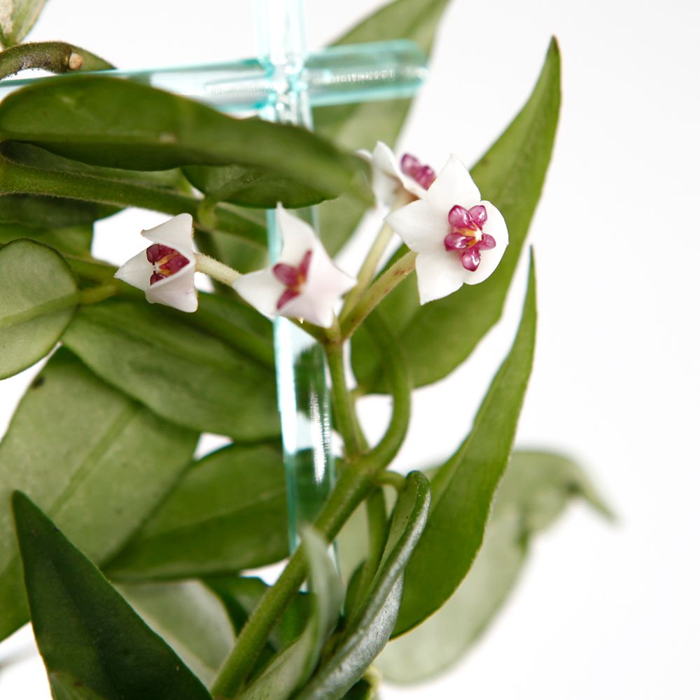Hoya bella, även kallad minivaxblomma, är en elegant och kompakt klätterväxt som bjuder på delikata, stjärnformade blommor med vita kronblad och en purpurröd mitt. När den odlas på växtstöd formas den till en prydlig och attraktiv silhuett, vilket gör den perfekt som en iögonfallande detalj i hemmet.