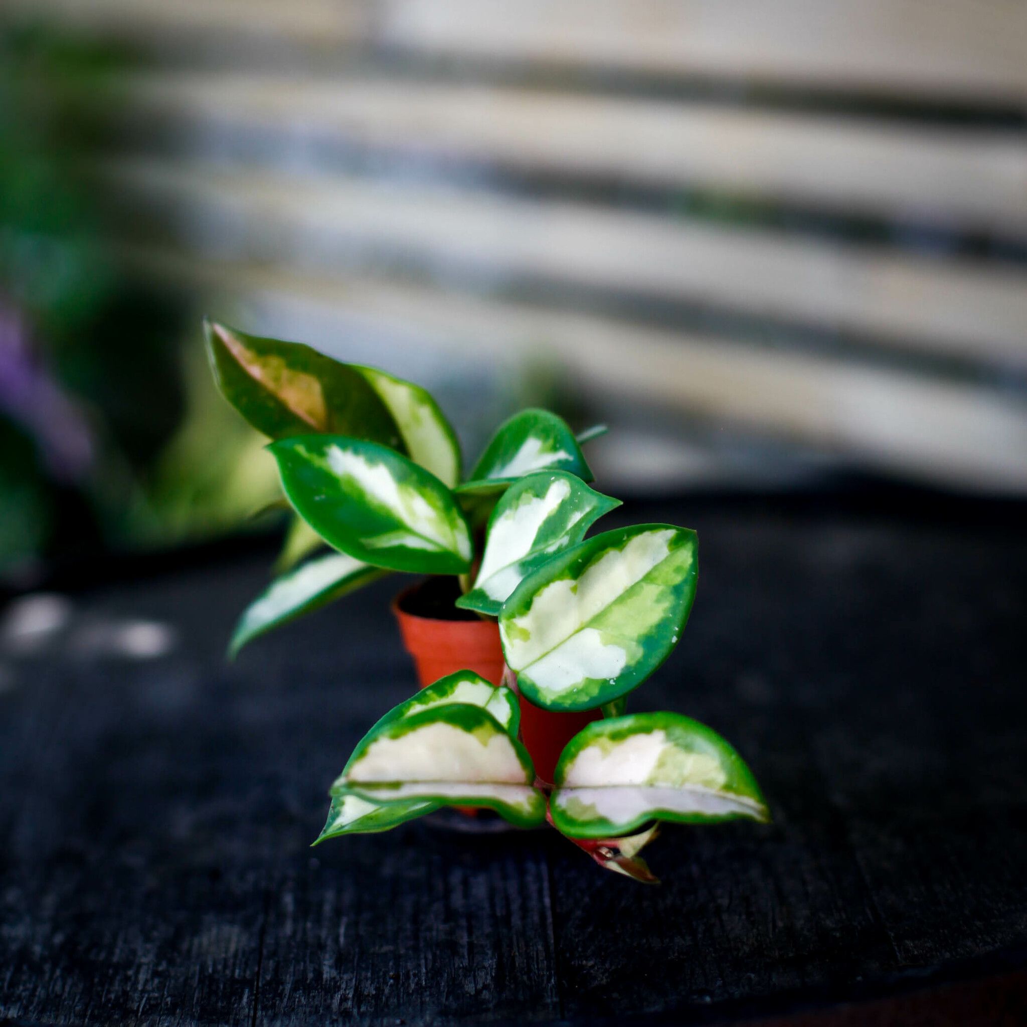 Hoya 'Krimson Queen' - en tålig, skön växt med vaxlika blad och stjärnformade blommor. Perfekt för amplar. Läs mer på klorofyllverket.se.