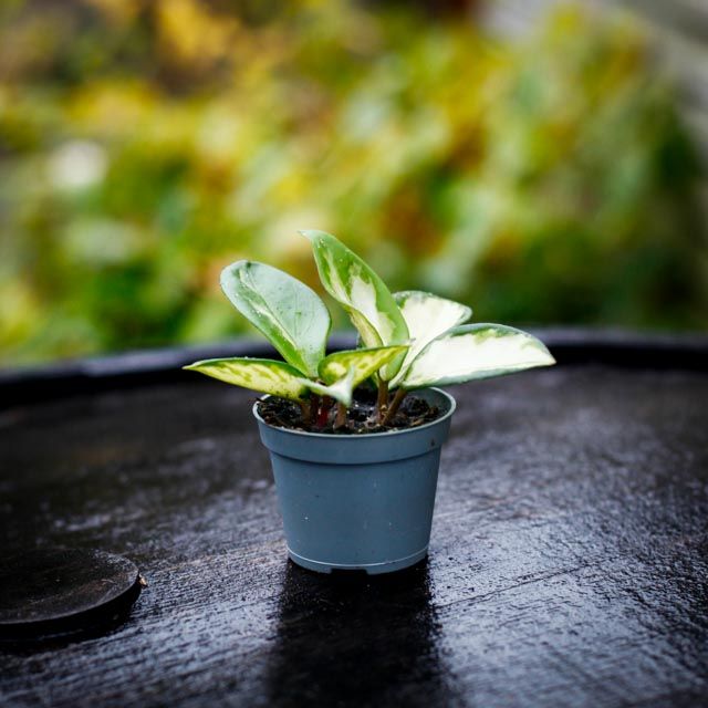 Bladen är tjocka, glansiga och lätt ovala med en krämvit till ljusgrön mitt och mörkare gröna kanter. Vissa blad får även rosa nyanser, särskilt i starkt ljus. Rankorna växer stadigt och kan bli långa, vilket gör växten väl lämpad för både ampel och klätterstöd. Variegeringen varierar mellan olika plantor och blad, vilket gör varje exemplar unikt.