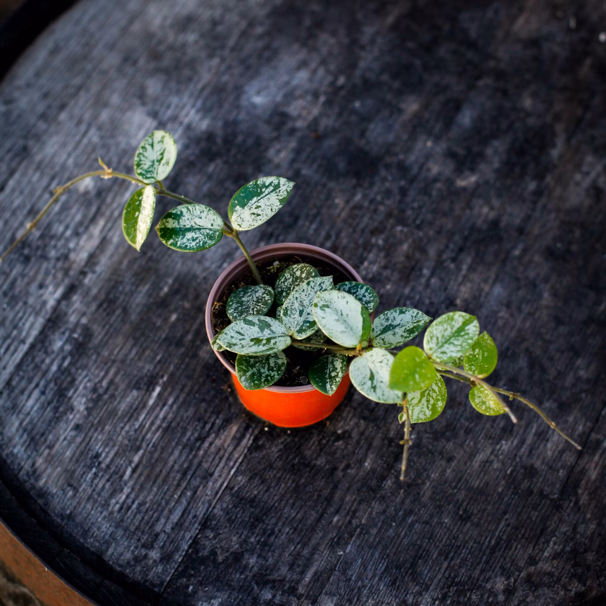 Hoya cv ’Mathilde Splash’, även kallad porslinsblomma, är en korsning mellan Hoya carnosa och Hoya serpens ur familjen Apocynaceae. Den är särskilt uppskattad för sina dekorativa blad som är täckta av silvriga ”splashes” samt sina små, bollformade blommor. Hoya är en tropisk växt som härstammar från Asien och Australien och odlas ofta som en lättskött och långlivad krukväxt.