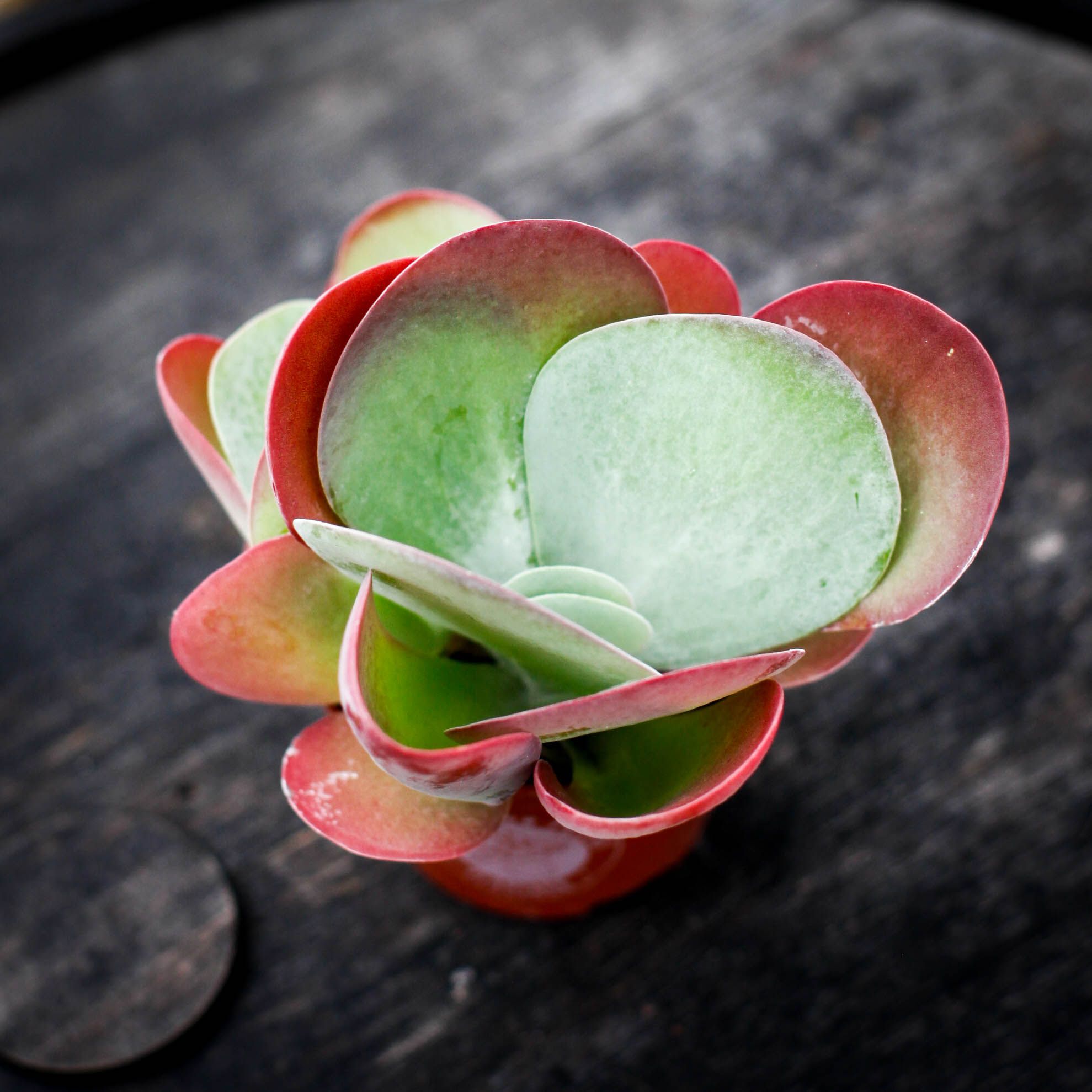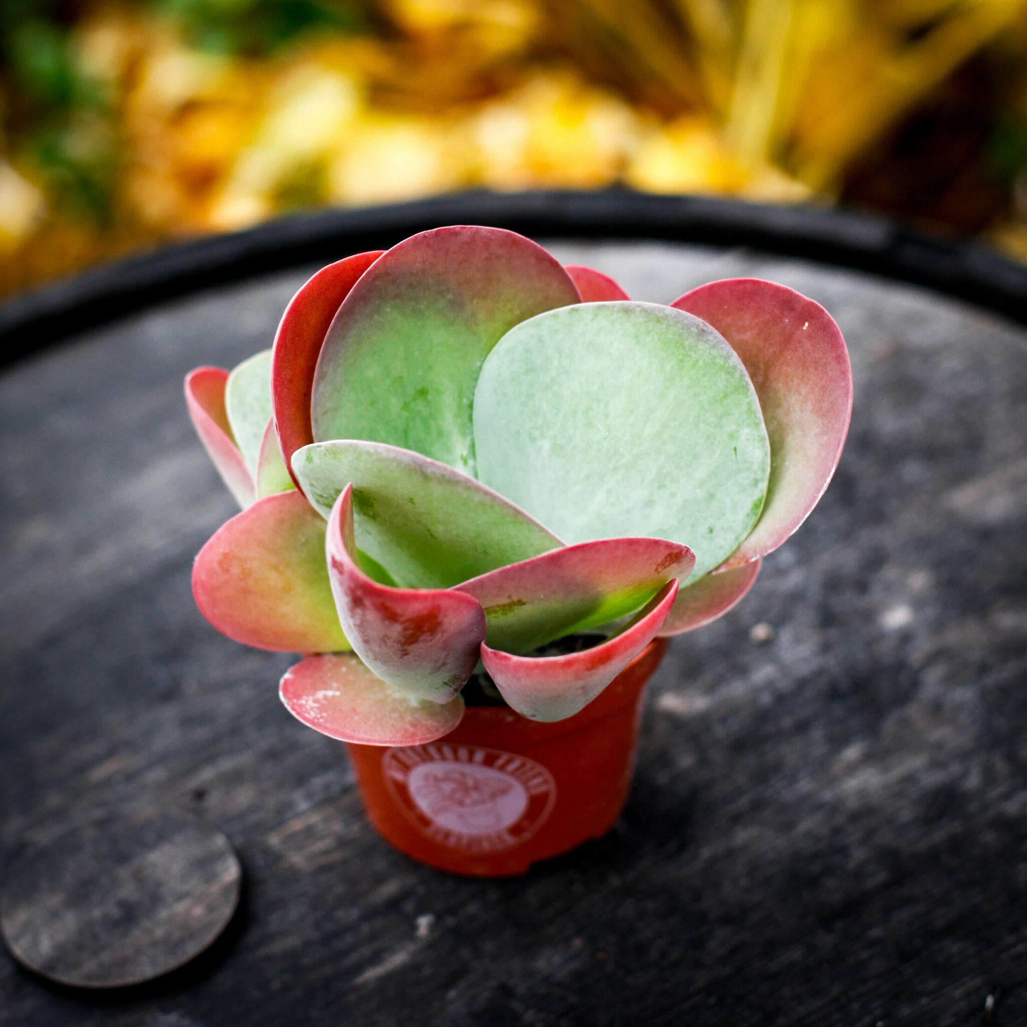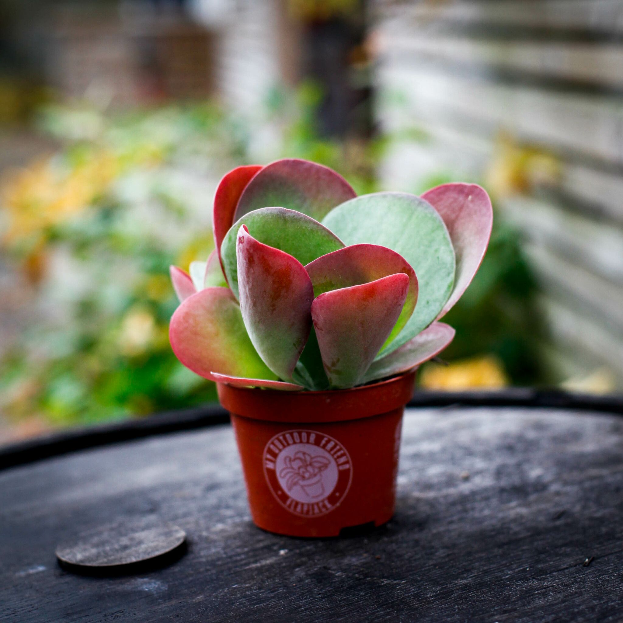 Kalanchoe thyrsiflora, även kallad Doftkalanchoe 'Red Lips', är en suckulent med rundade, frostiga blad i grönt och rött, perfekt för både inomhus och ute.