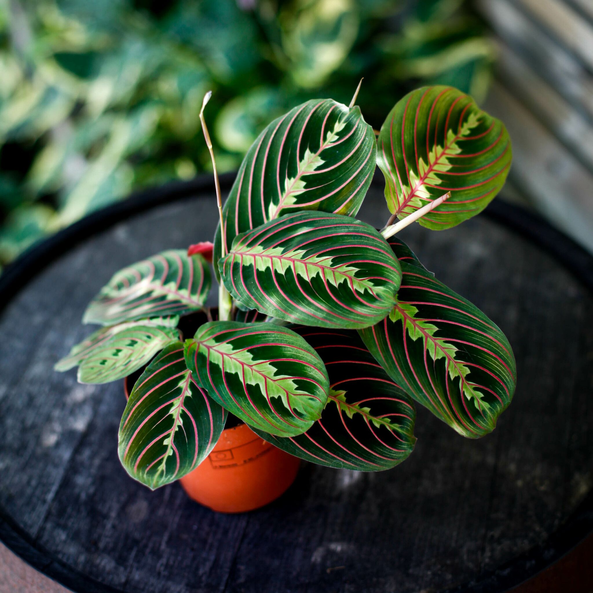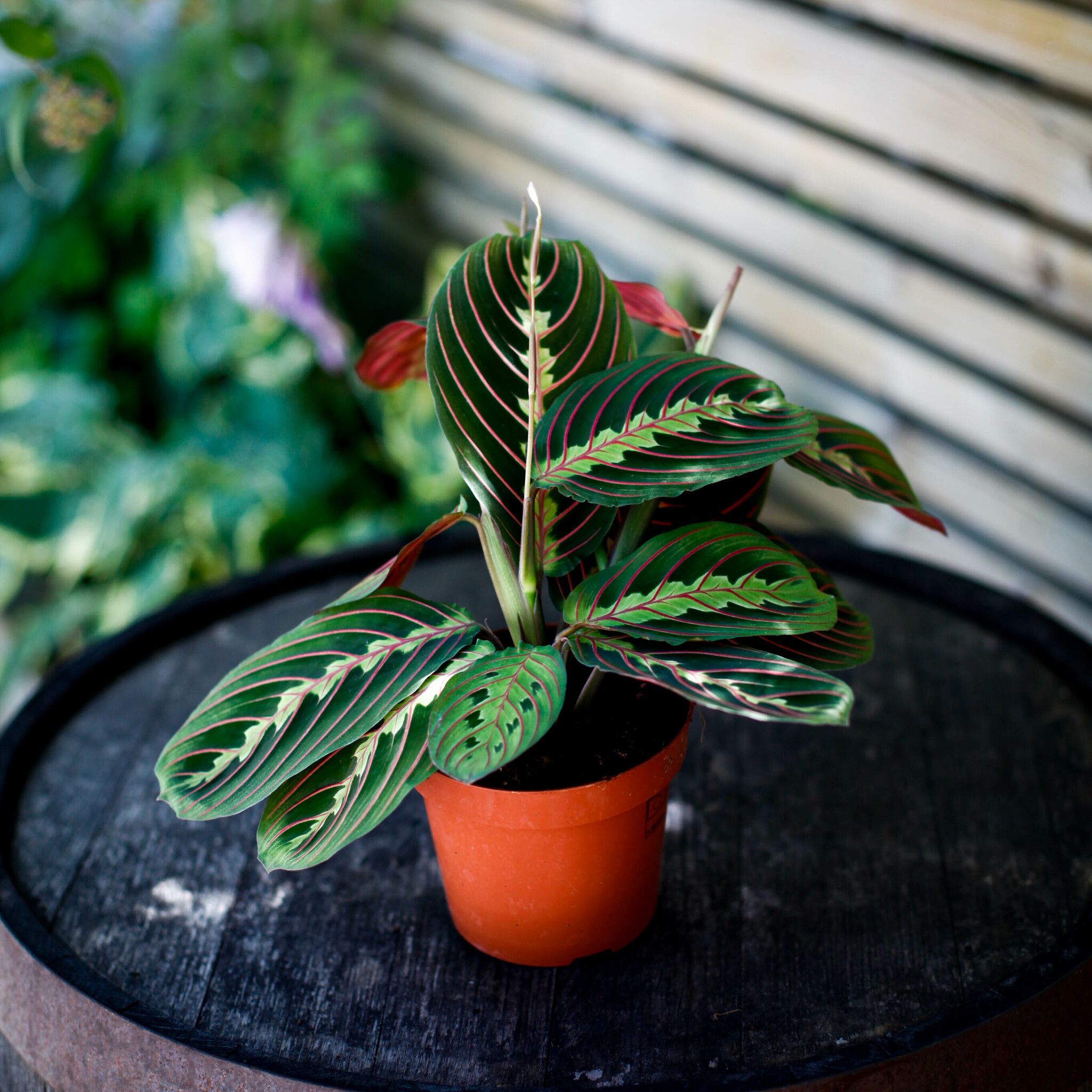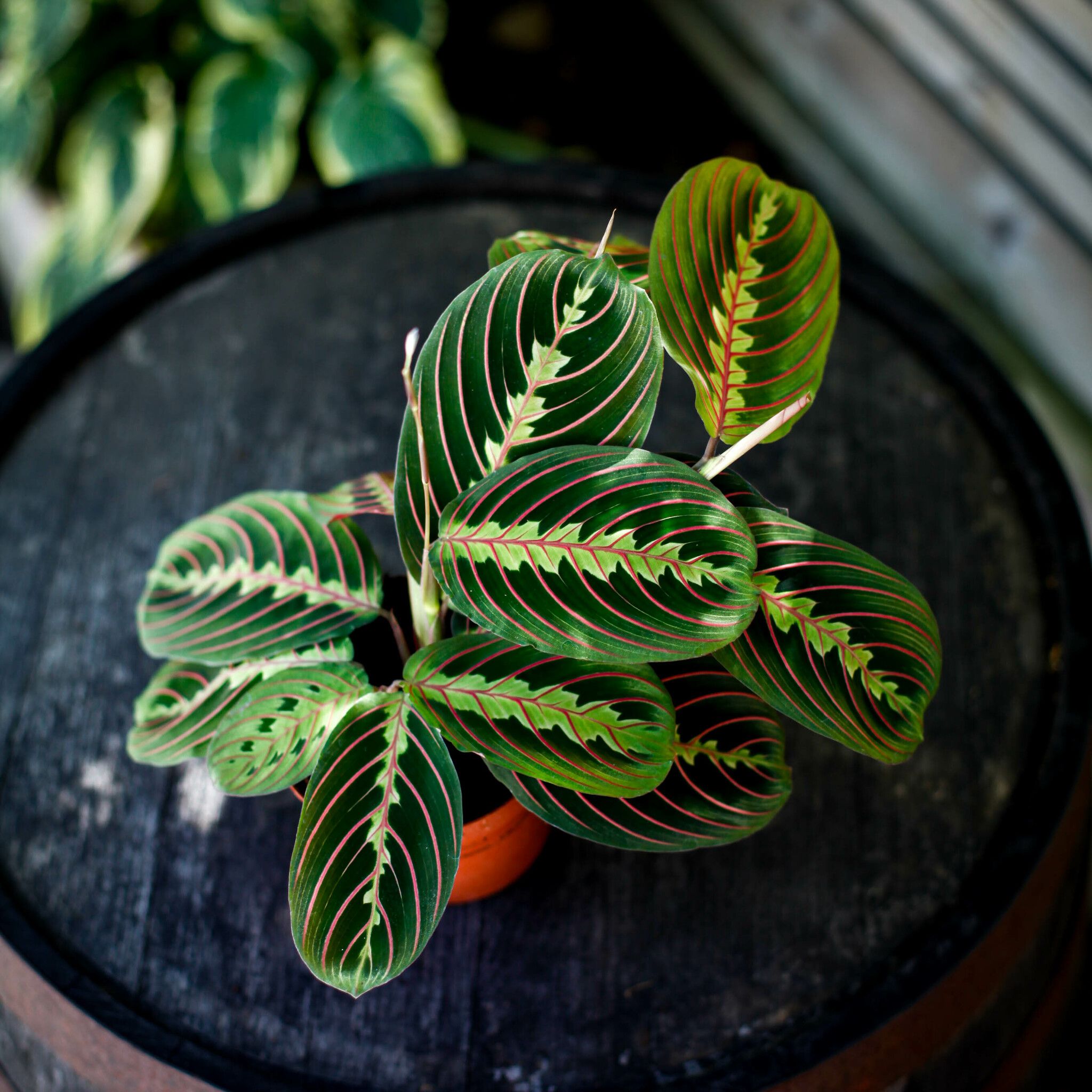 Maranta Leuconeura Fascinator Tricolor, även känd som trikolor-marantan, är en iögonfallande växt med ovala, gröna blad dekorerade med ljusgröna vener och djupröda undersidor. De färgglada bladen rör sig och "ber" på natten, vilket ger den smeknamnet "bönväxt". Den trivs bäst i indirekt ljus och fuktig jord, vilket gör den till ett utmärkt val för att tillföra färg och liv till inomhusmiljöer. Växer lite som den själv vill, breder ut sig åt alla håll och kanter. Passar väldigt bra i ampel!