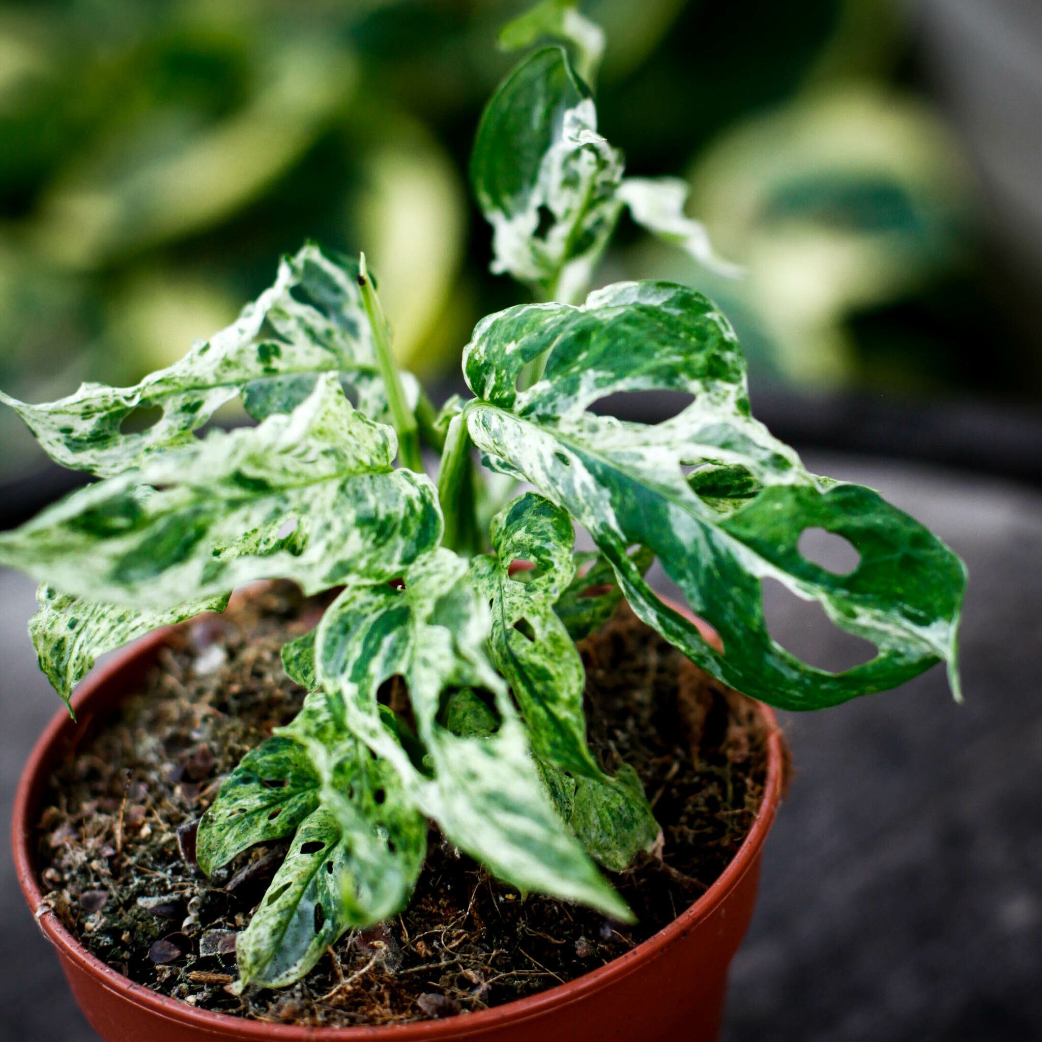 Monstera adansonii 'Frozen Freckles' 12 cm - en unik klätterväxt med vitgröna fläckar som "frusna fräknar". Perfekt för ljusa, indirekta platser.Upptäck mer på