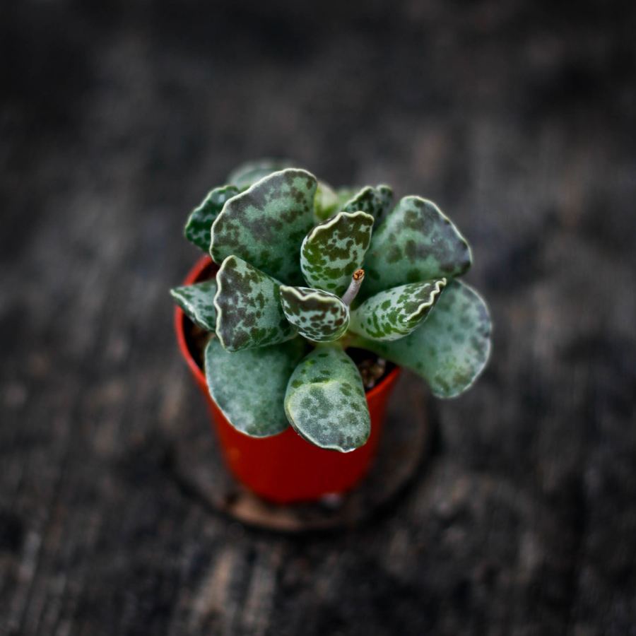 Adromischus cooperi, 6 cm, är en unik och vacker suckulent som tillför en exotisk charm till inredningen med sina fläckiga, rundade blad och lättskötta natur.