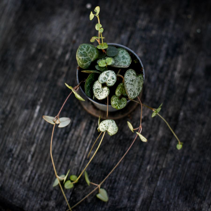 Ceropegia woodii, även känd som String of Hearts eller Rosary Vine, är en vacker och unik krukväxt som är älskad för sina hängande, hjärtformade blad och sina dekorativa trådar. Den här växten är perfekt för inomhusmiljöer där den kan hänga fritt eller växa i en hängande kruka, och den ger en vacker, nästan "bohemisk" känsla till rummet. Ceropegia woodii är lätt att sköta och en utmärkt växt för både nybörjare och erfarna växtägare.
