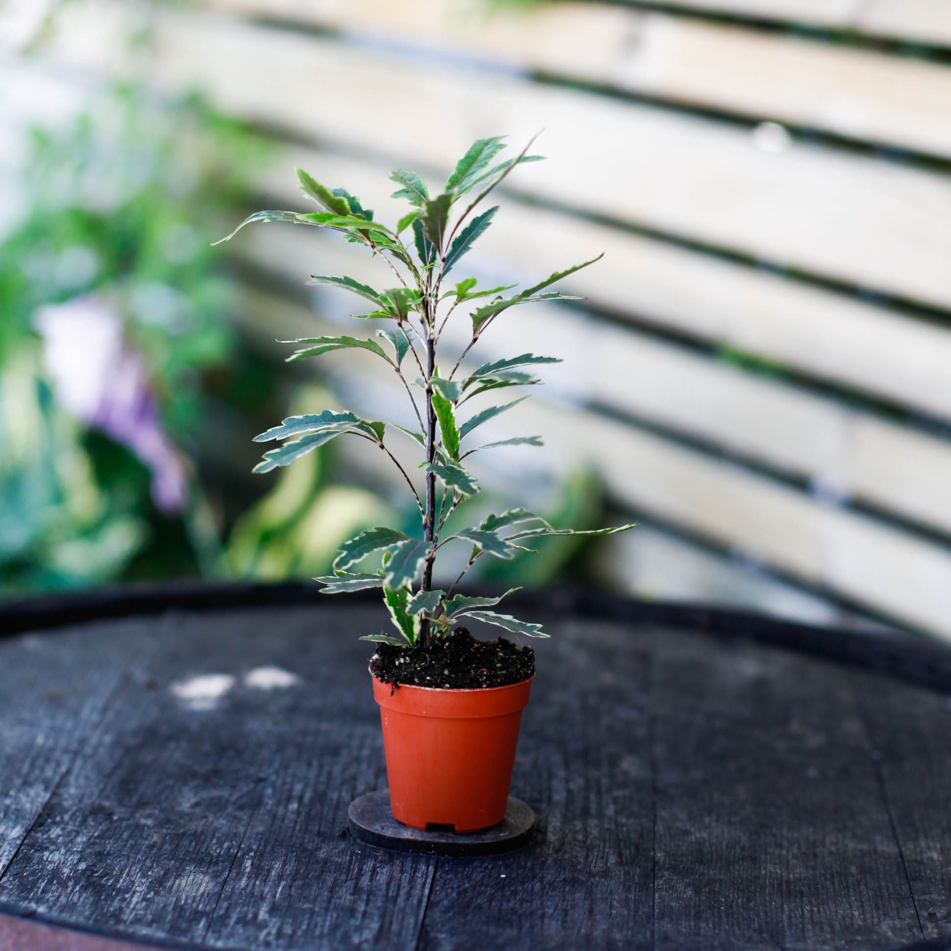 Dizygotheca elegantissima 'Bianca' 6 cm, har smala, flikiga blad med ljusa kanter. Perfekt som en elegant inomhusväxt för indirekt ljus.