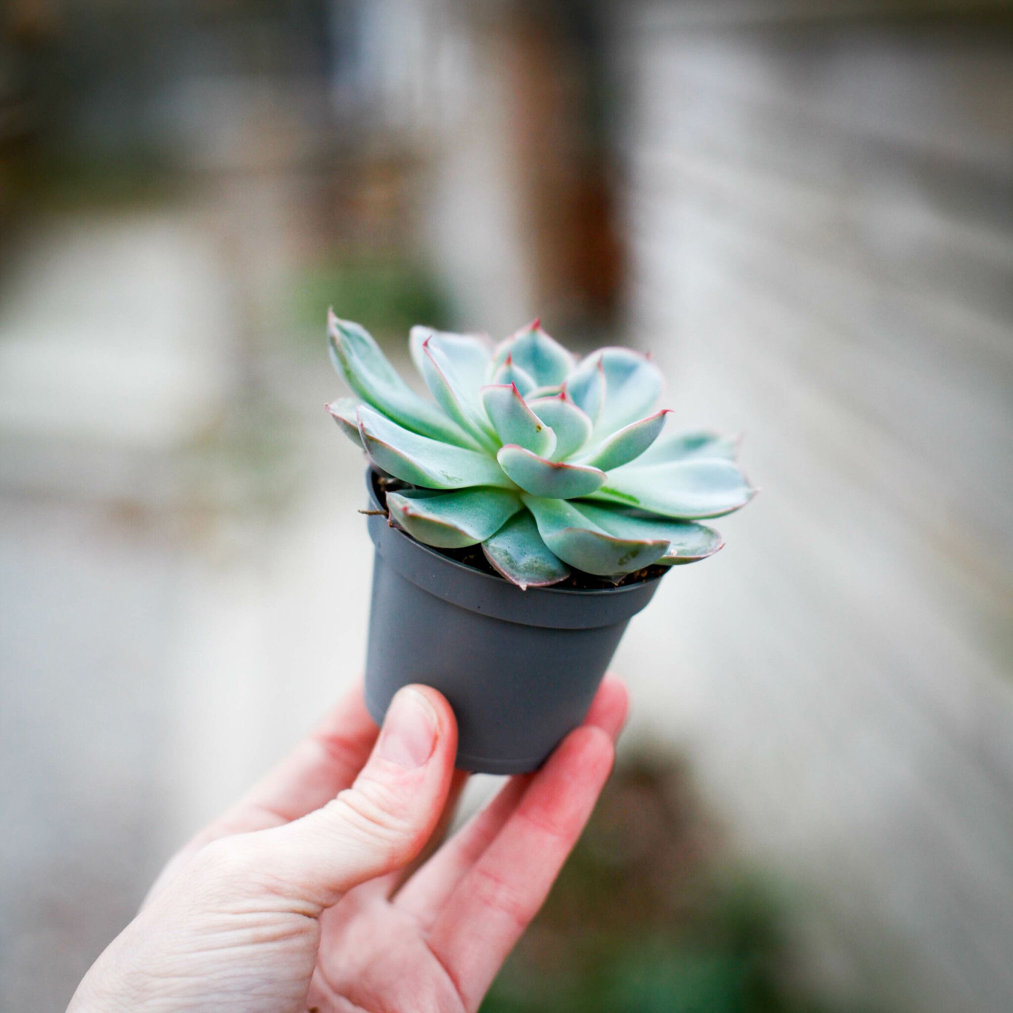 Echeveria 'Shira' – en elegant suckulent med grågröna blad och rödaktiga kanter, perfekt för inomhusmiljöer. Lättskött och stilren för alla växtälskare.