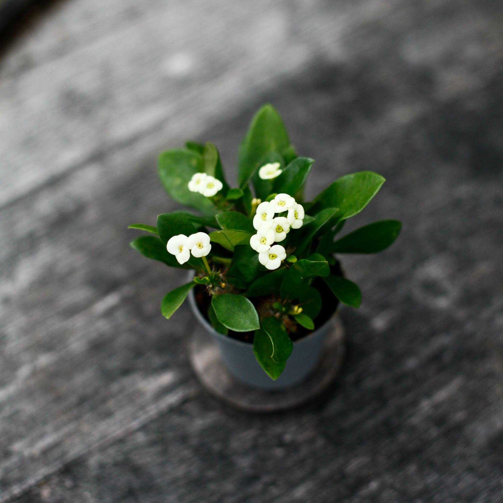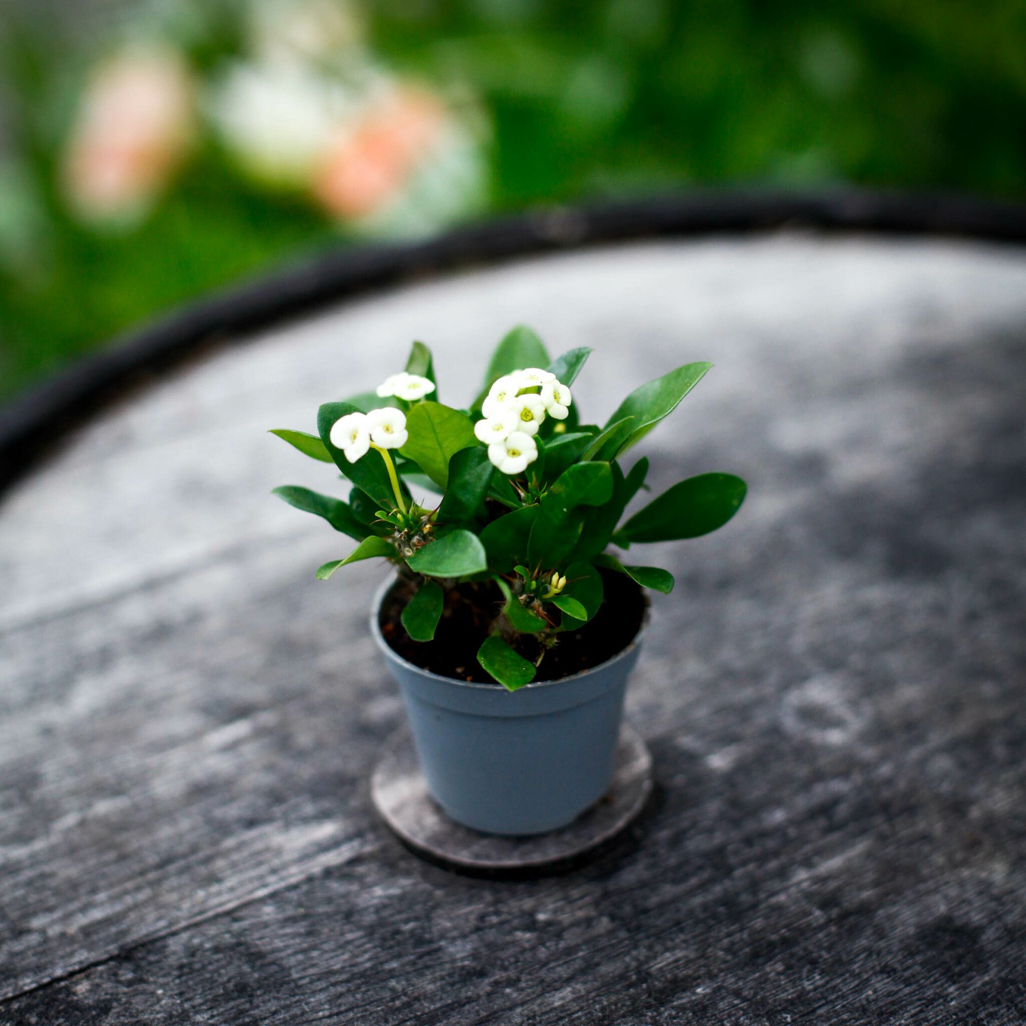 Euphorbia milii 'Hector' - Kristi Törnekrona: En lättskött, blomvillig växt med vita blommor. Perfekt för soliga fönster. Köp hos Klorofyllverket.se.