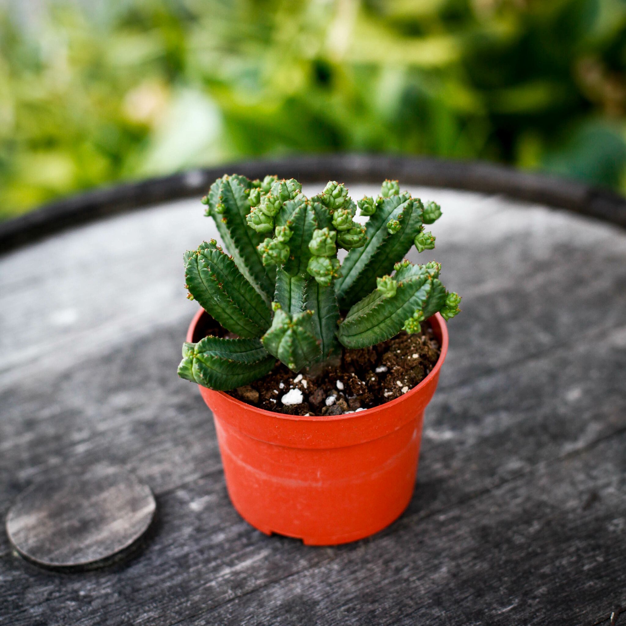 Euphorbia Tubiglans – en skulptural suckulent med blågröna, cylindriska stammar och små gulgröna blommor. Perfekt för soliga fönster och samlarhyllor.