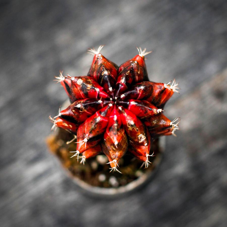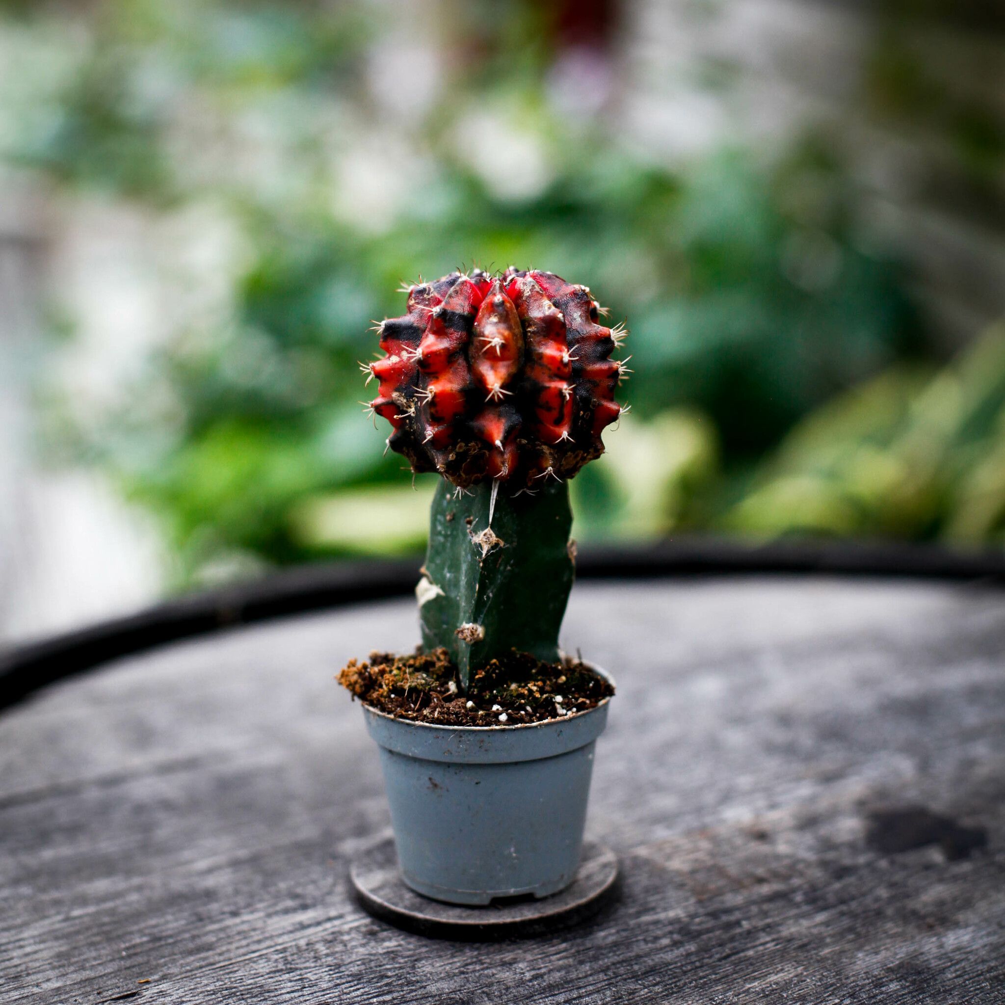 Gymnocalycium mihanovichiib 6 cm, röd, eller "Moon Cactus", har en klarröd topp på en grön bas. Lättskött, trivs i indirekt ljus och är perfekt för små utrymmen