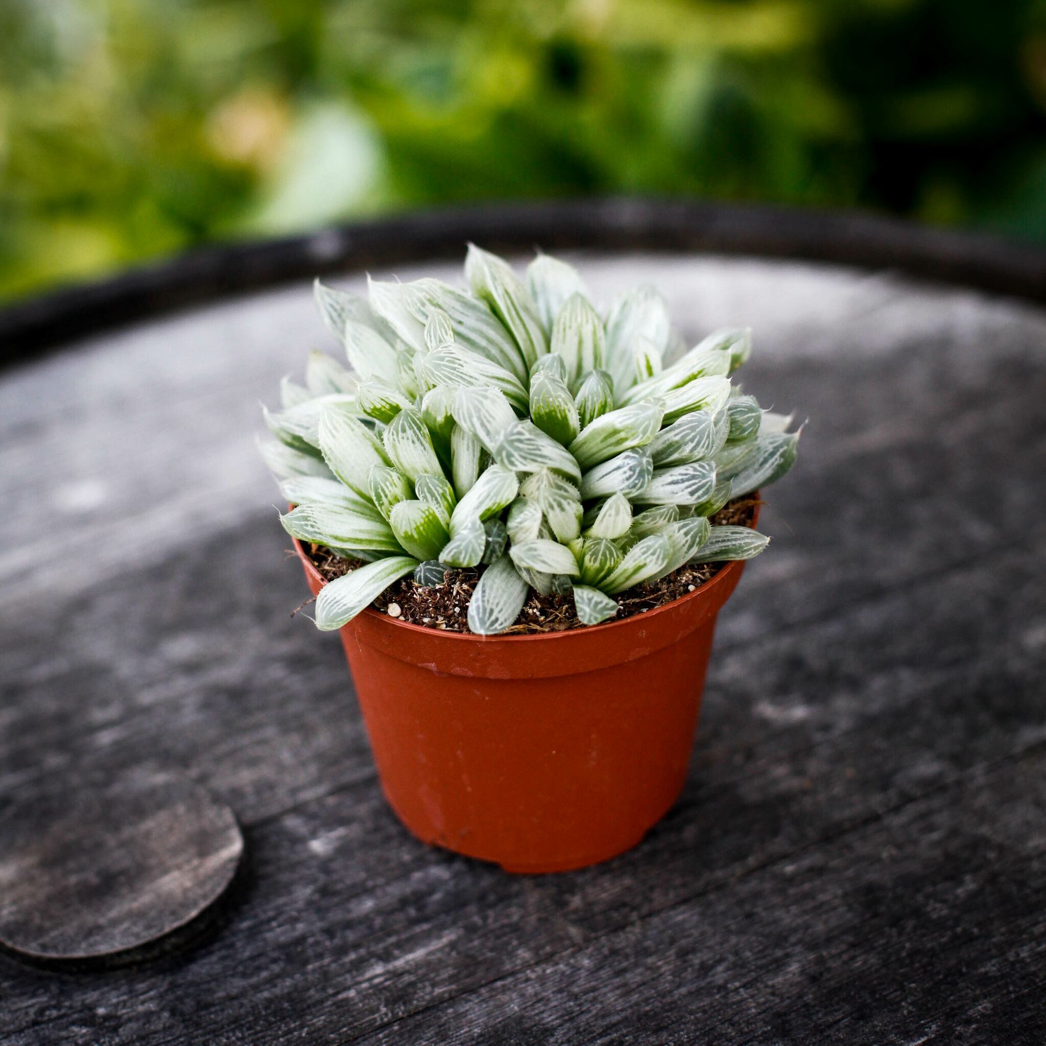 Haworthia cymbiformis 'White Tiger' – en elegant och tålig suckulent med unika vita strimmor. Perfekt för inomhusträdgården. Köp nu på Klorofyllverket.se.
