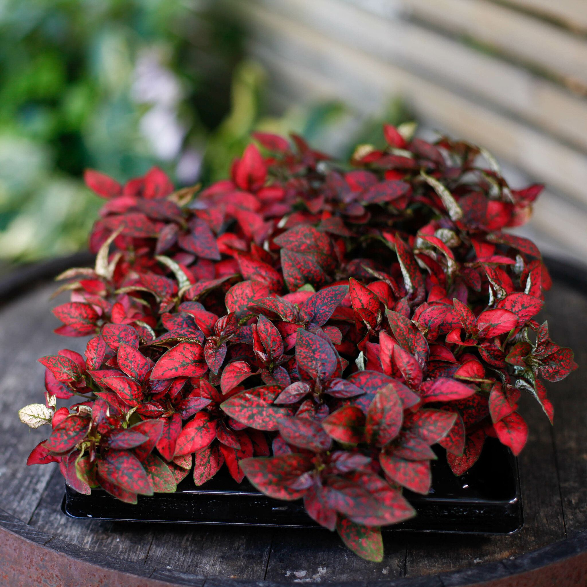 Rosenstänk är en lättskött växt och finns i olika färger. Denna är röd med mörka stänk på bladen.
