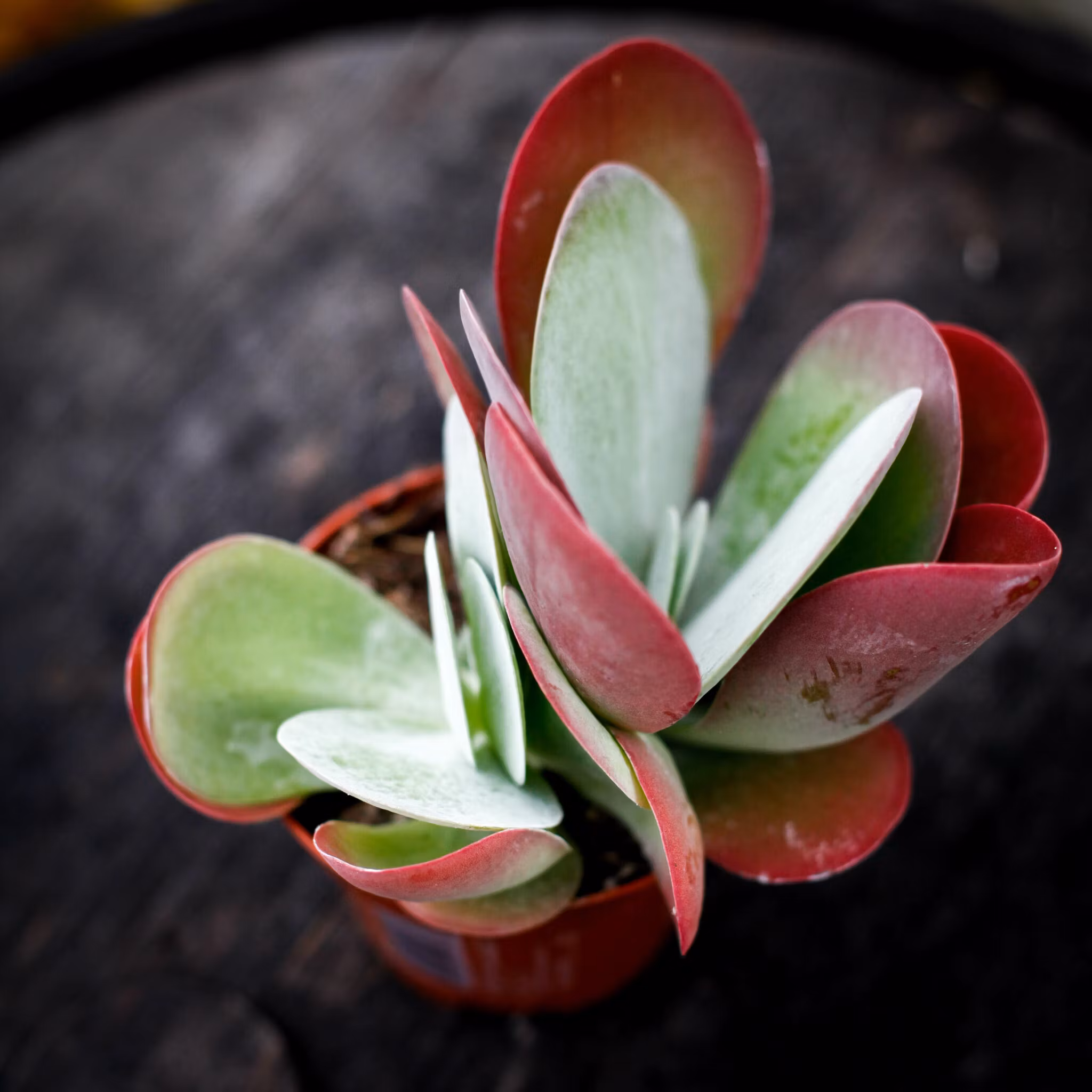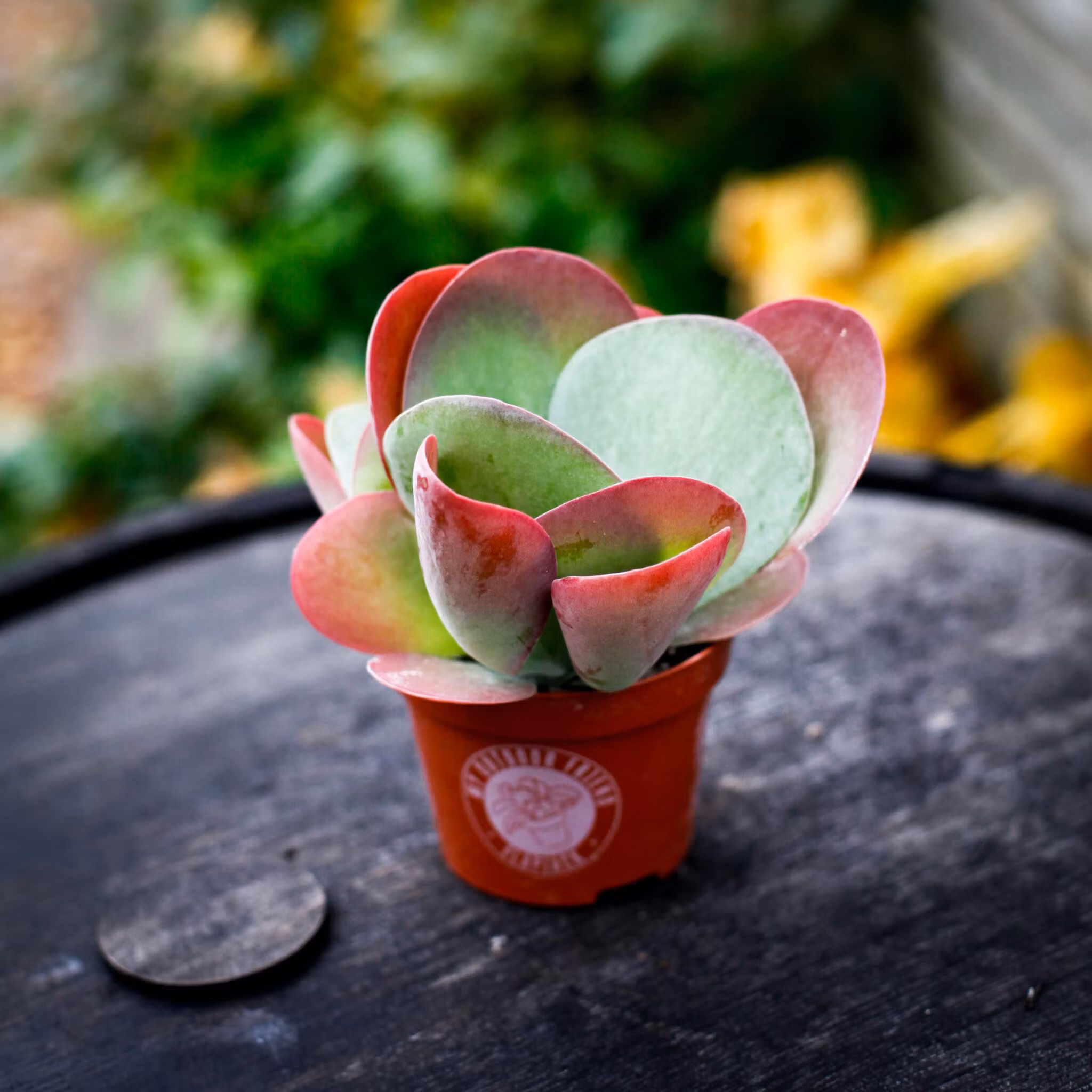 Kalanchoe thyrsiflora, även kallad Doftkalanchoe 'Red Lips', är en suckulent med rundade, frostiga blad i grönt och rött, perfekt för både inomhus och ute.