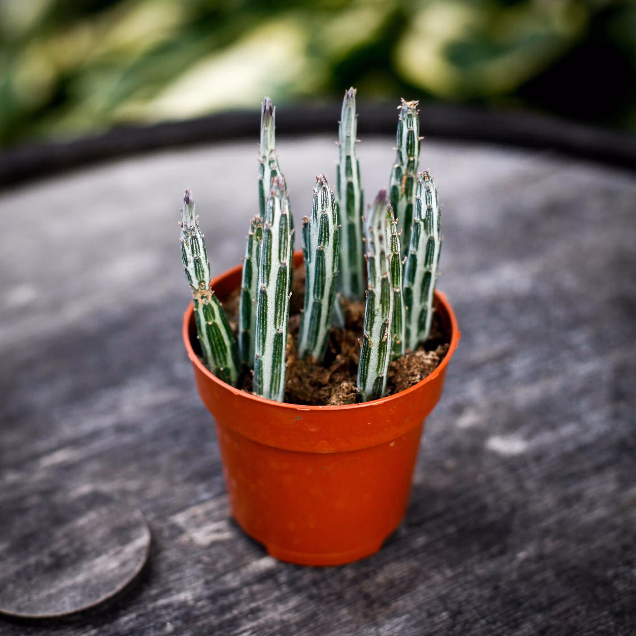 Kleinia stapeliiformis, även kallad "Ormtagg", är en fascinerande suckulent med zebramönstrade stjälkar. Perfekt för unika växtsamlingar.
