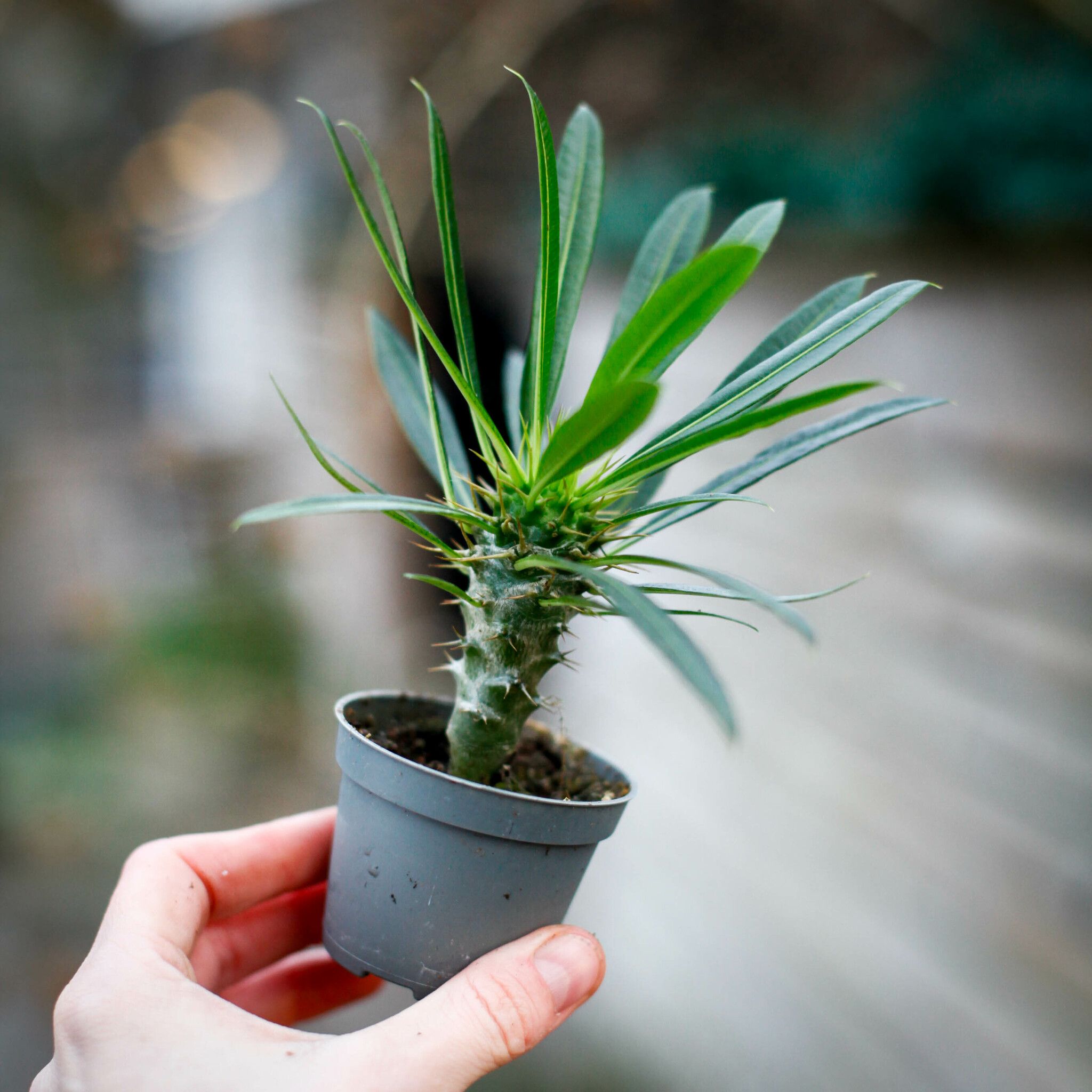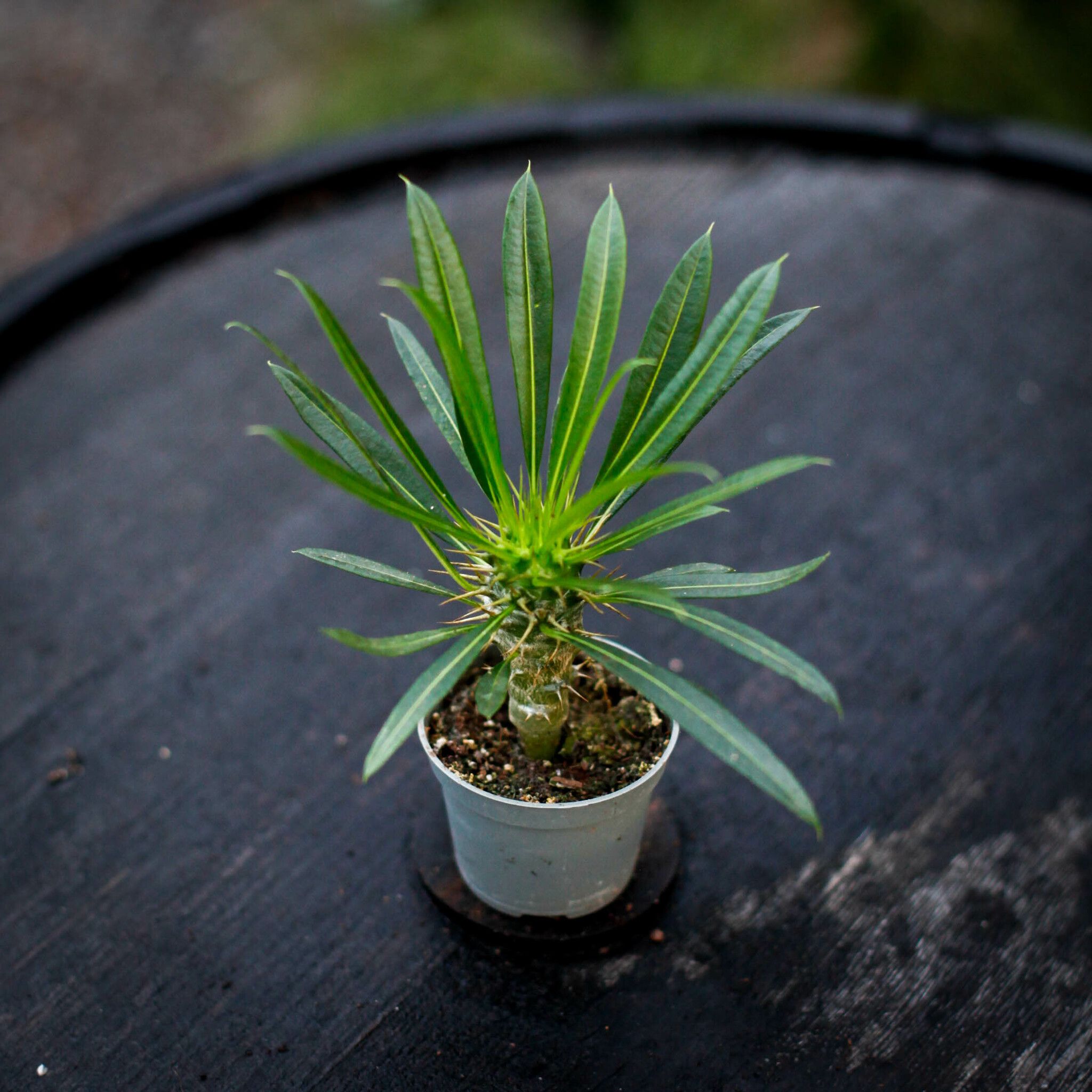 Pachypodium Lamerei, även känd som Madagaskarpalmen, är en unik och tålig växt med ett exotiskt utseende. Trots sitt palmliknande uttryck är den faktiskt en suckulent, nära besläktad med kaktusar. Med sin tjocka, taggiga stam och eleganta smala blad är den ett spektakulärt tillskott till alla växtsamlingar, både inomhus och i varma klimat utomhus.