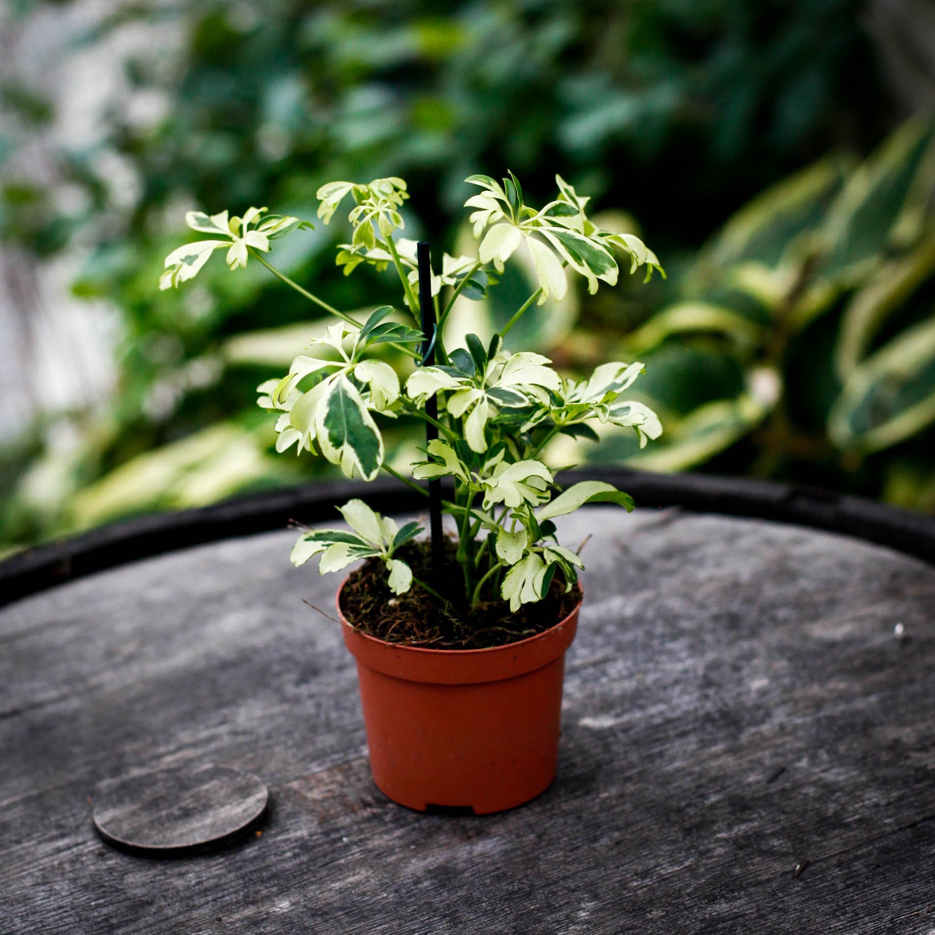 Schefflera arboricola 'Janine' - Variegerad Paraplyaralia: Dekorativ krukväxt med unika, krämfärgade bladkanter. Perfekt för ljusa, indirekta miljöer. Skötselvä