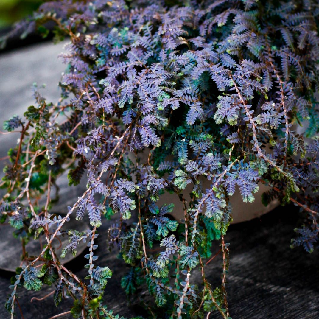 Upptäck Selaginella uncinata 'Patina' hos Klorofyllverket.se: en magisk, metalliskt skimrande regnbågsspikmossa för skuggiga växtarrangemang.