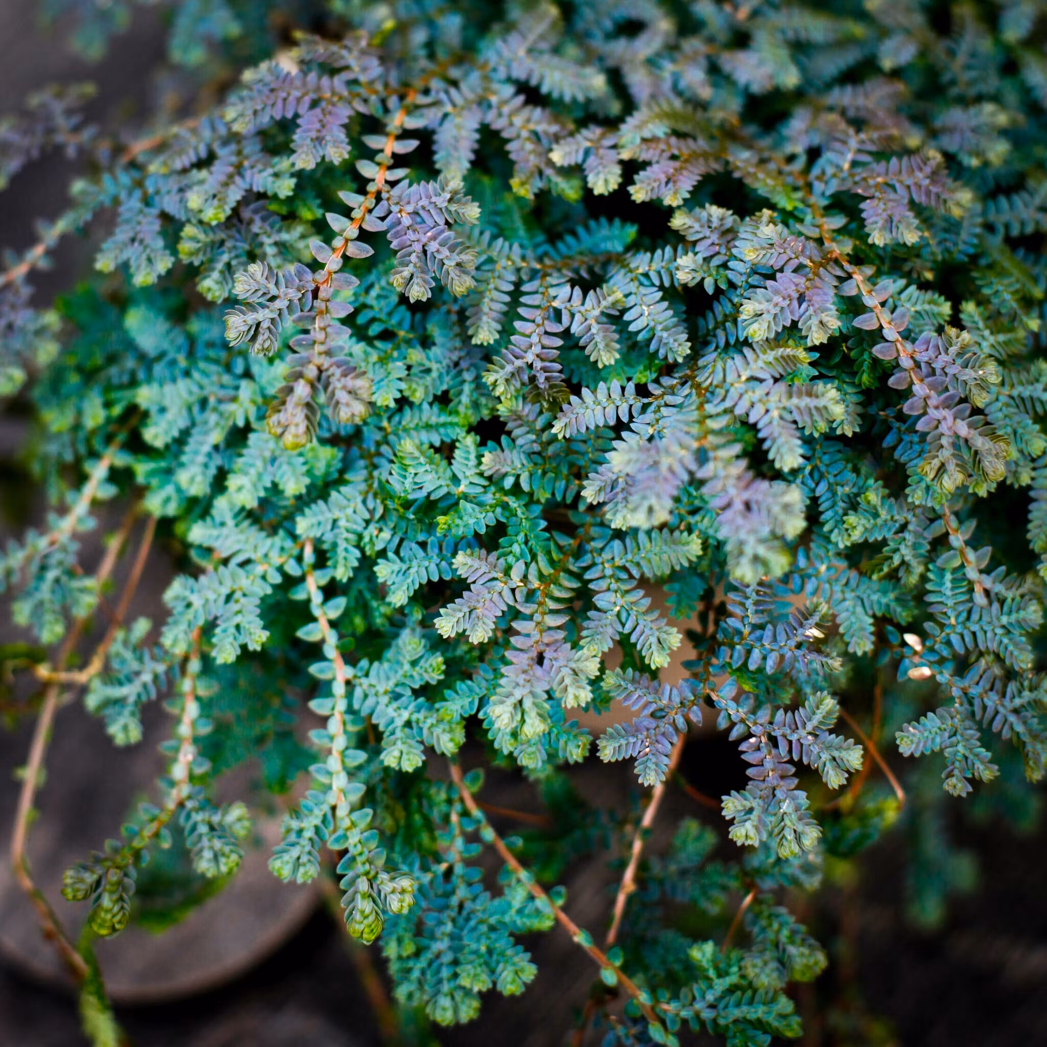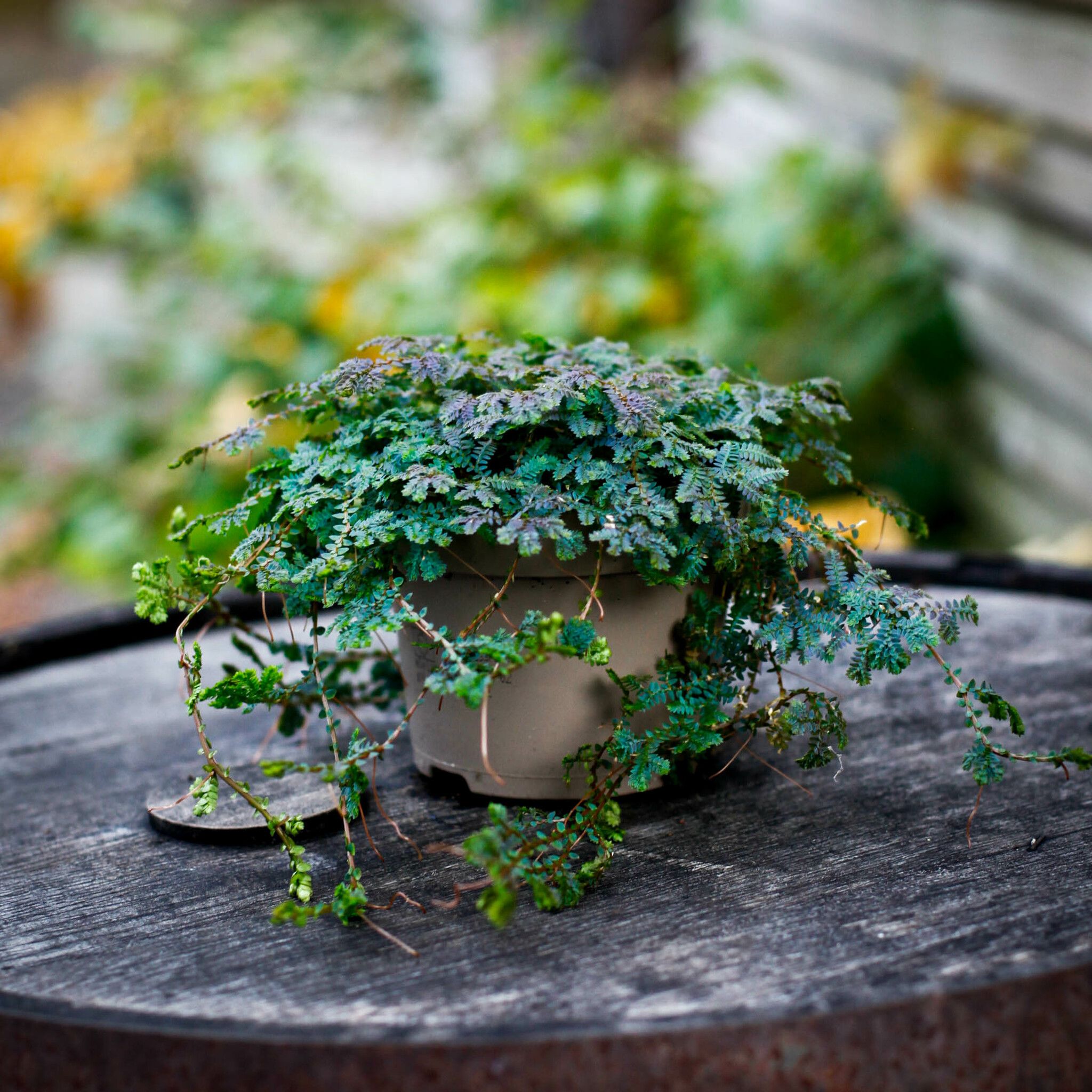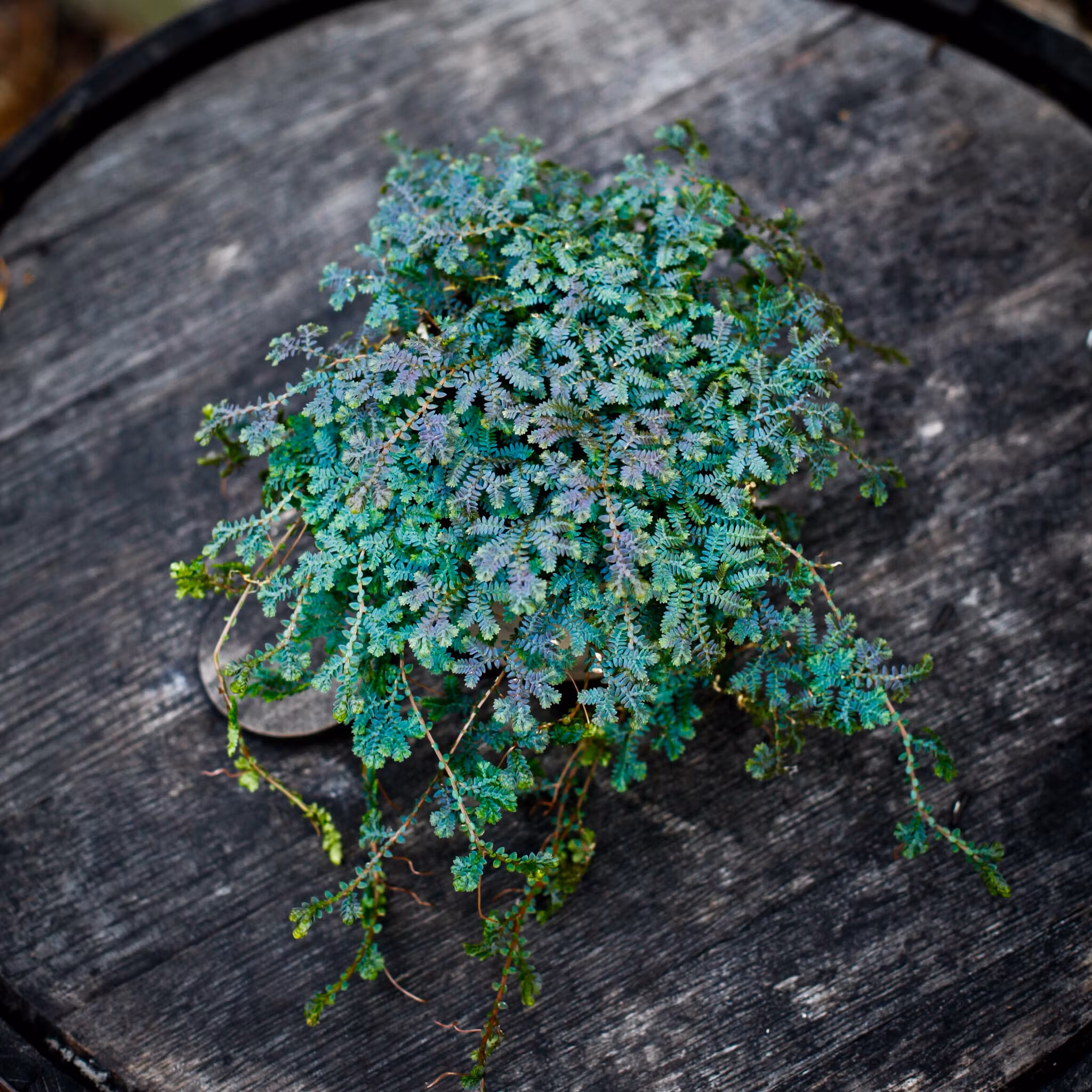 Selaginella uncinata 'Peacock' – en fascinerande påfågelsmossa med skimrande blågröna blad, perfekt för halvskuggiga miljöer. Beställ hos Klorofyllverket.se.