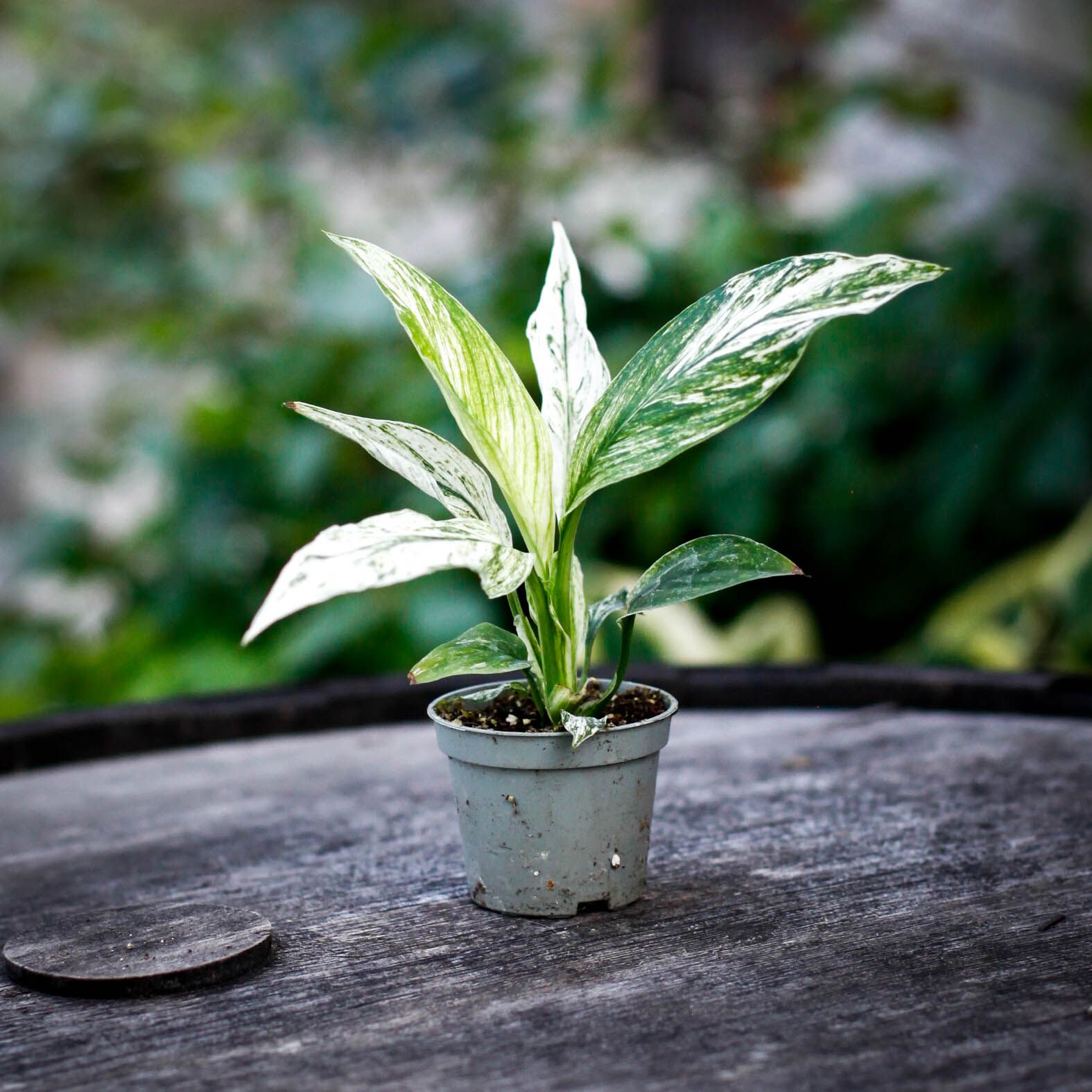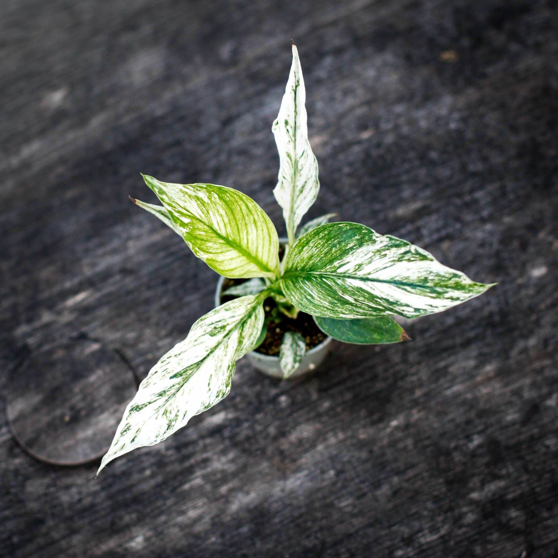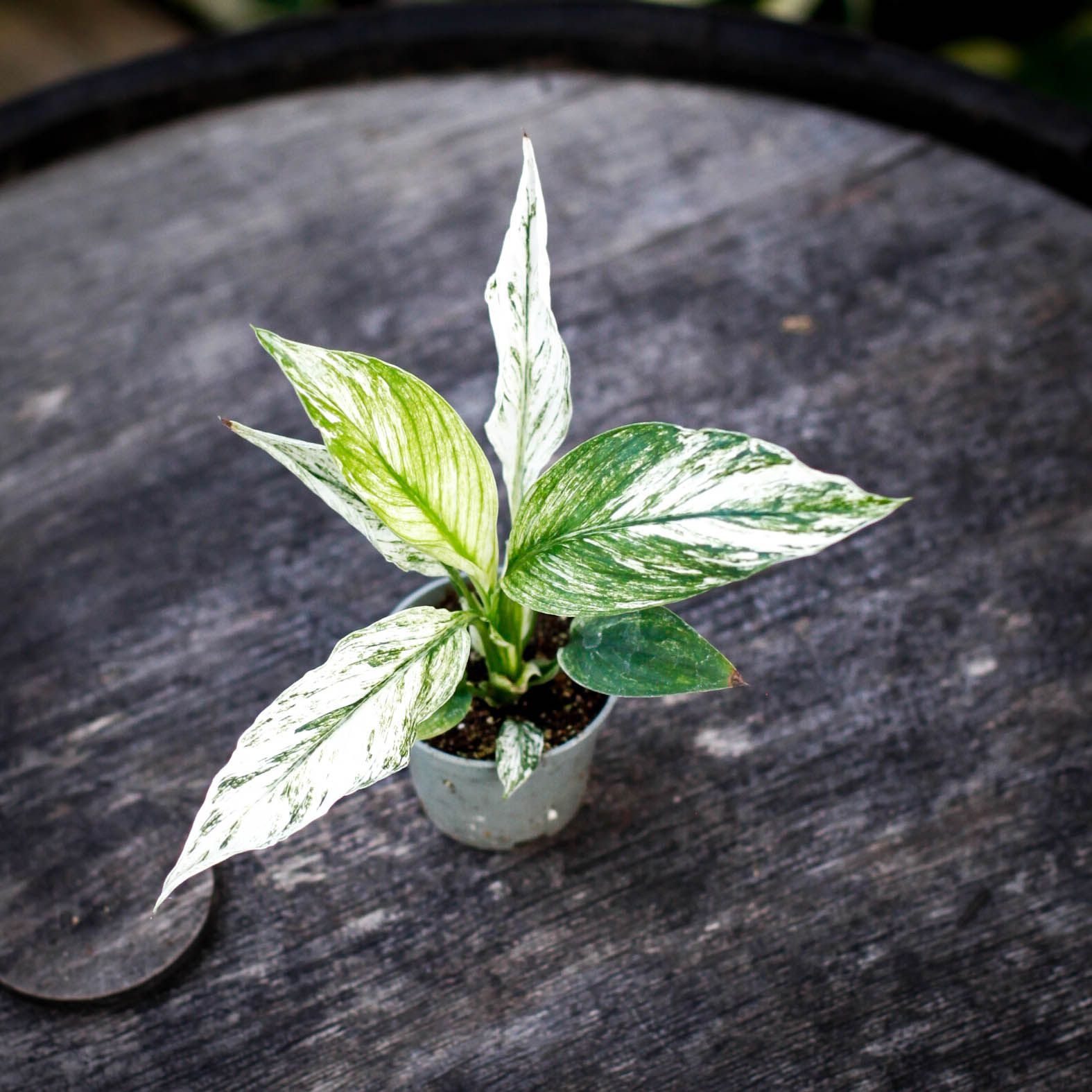 Spathiphyllum sensation ’Variegata’ - en exklusiv fredskalla med variegerade blad, idealisk för halvskugga. Perfekt för att ge rummet en lyxig touch.