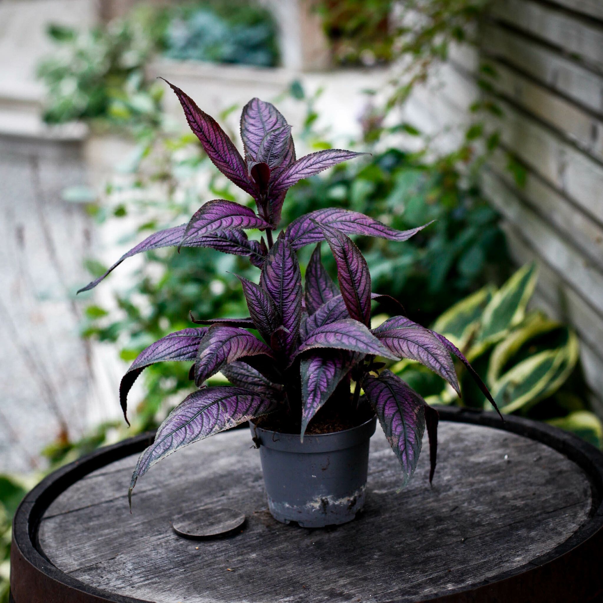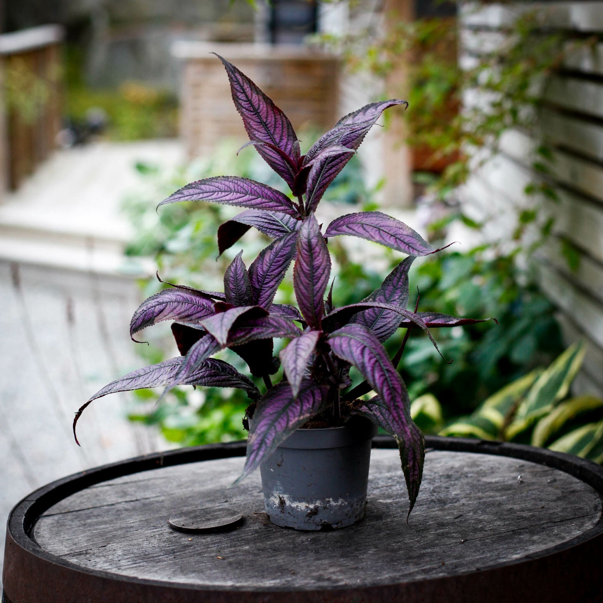 Upptäck Strobilanthes dyerianus 'Persian Shield' med sina skimrande lila blad, perfekt för att skapa exotisk atmosfär hemma. Köp på klorofyllverket.se.
