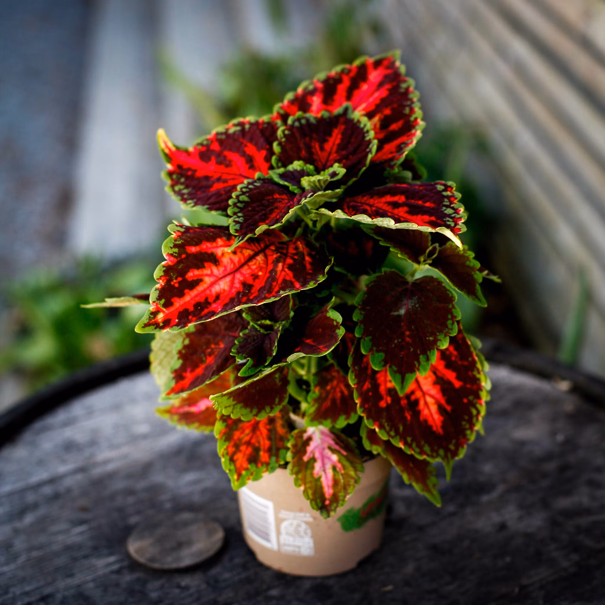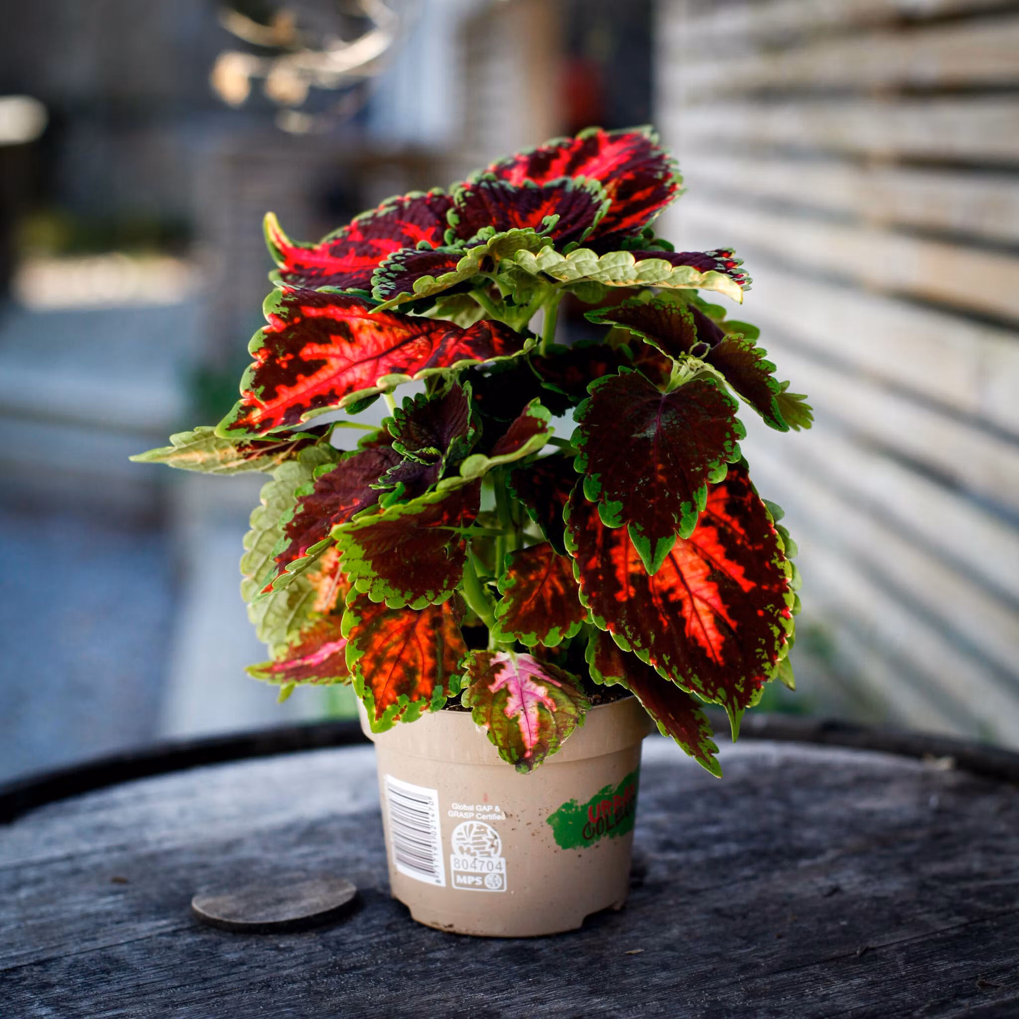 Coleus 'Flamboyant Flamingo' - En färgexplosion som förvandlar ditt hem med sina livfulla blad. Perfekt för både inomhus och utomhus. Köp nu!