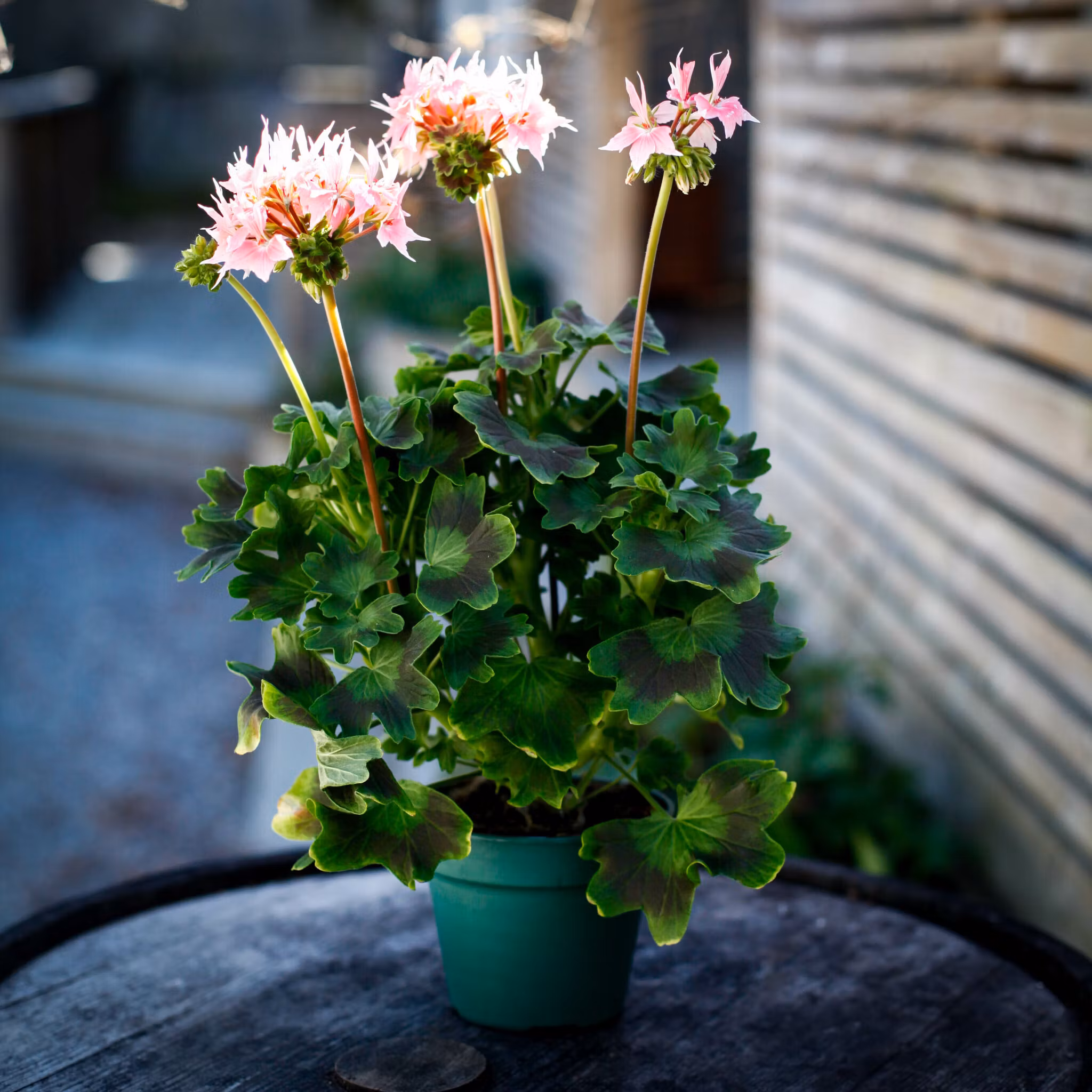 Stjärnpelargonen Summer Twist 'Rose' - Årets Pelargon 2025. Unik korallrosa skönhet, perfekt för balkong och trädgård. Enkel skötsel, riklig blomning.