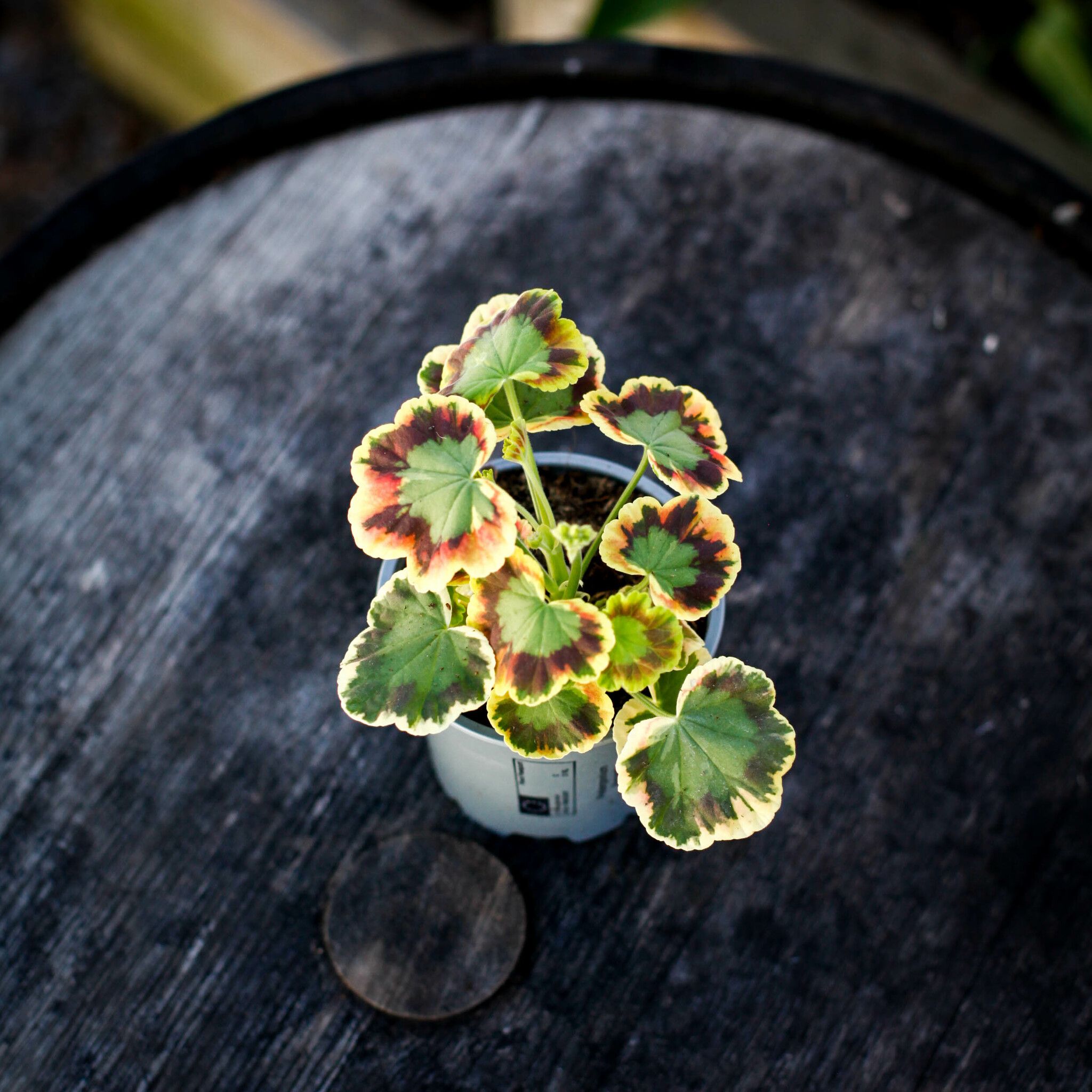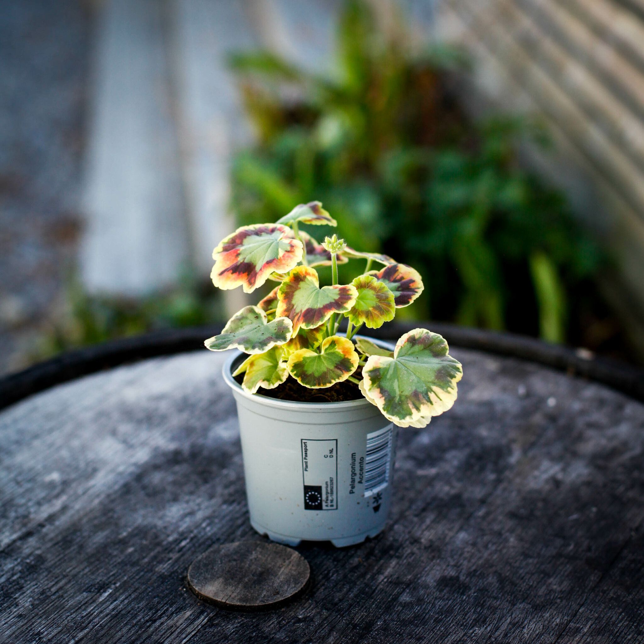 Pelargonium 'Contrast' - Zonalpelargon: En färgstark och elegant pelargon med röda blommor och trefärgade blad. Perfekt för både inomhus och utomhus.