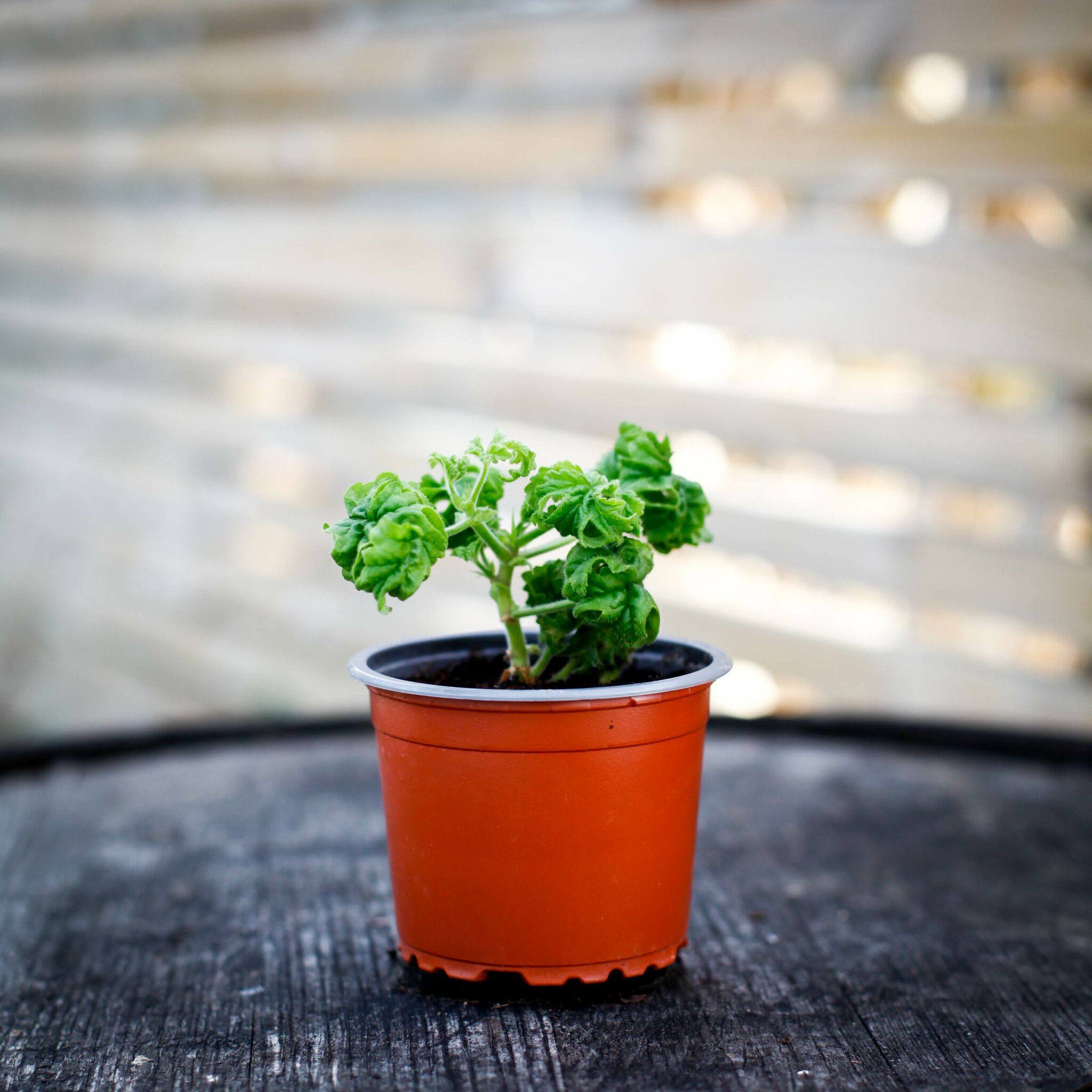 Upptäck Pelargonium 'Bontrosai', 8 cm, en sällsynt doftpelargon med bonsaikänsla. Perfekt för ljusa platser, lättvattning och svag näring vår till höst.
