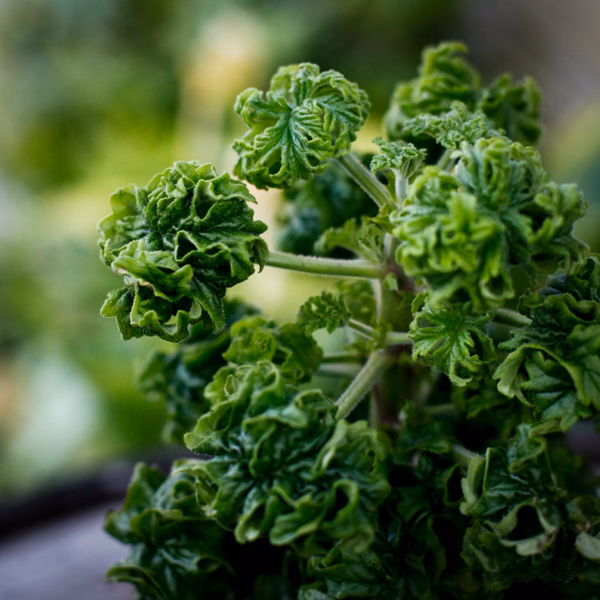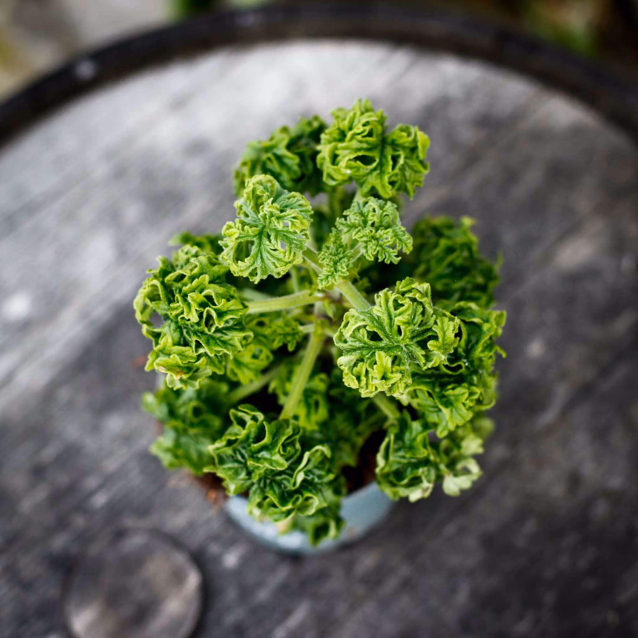 Pelargonium 'Bontrosai' - unik doftpelargon med ros- och citrusdoft. Trivs i sol och väldränerad jord. Köp nu hos Klorofyllverket.se.