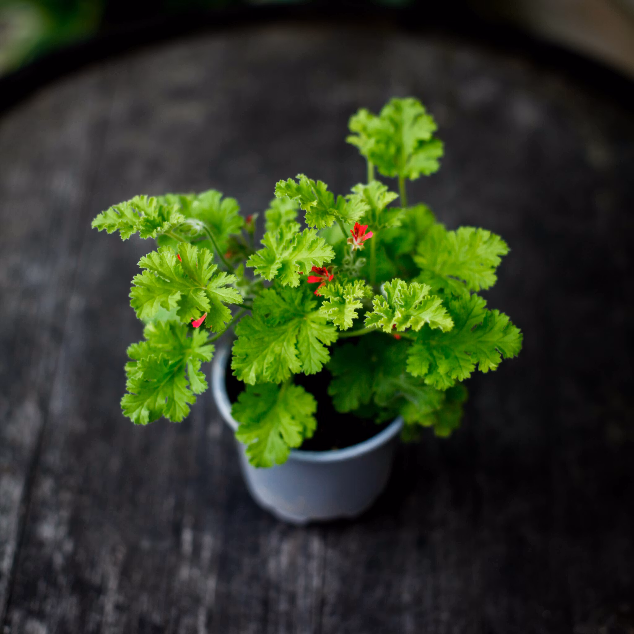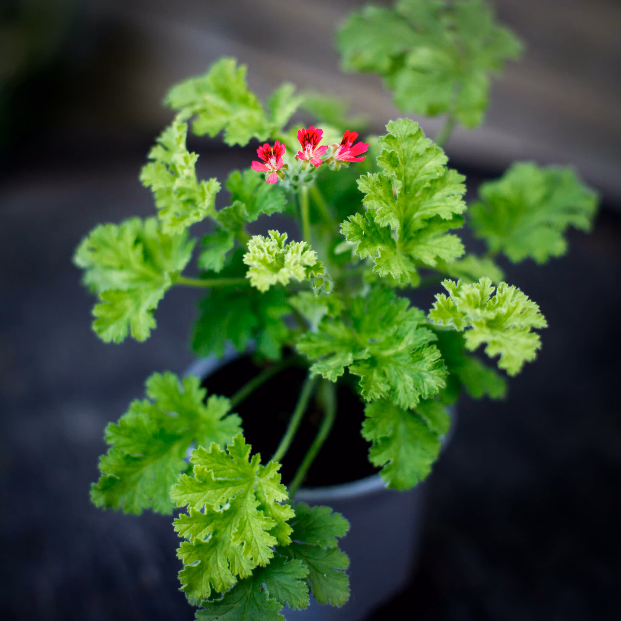 Upptäck Pelargoniu 'Concolour Lace' 9 cm – en doftpelargon med hasselnötsdoft och mörkrosa blommor. Perfekt för soliga fönster! Beställ hos Klorofyllverket.