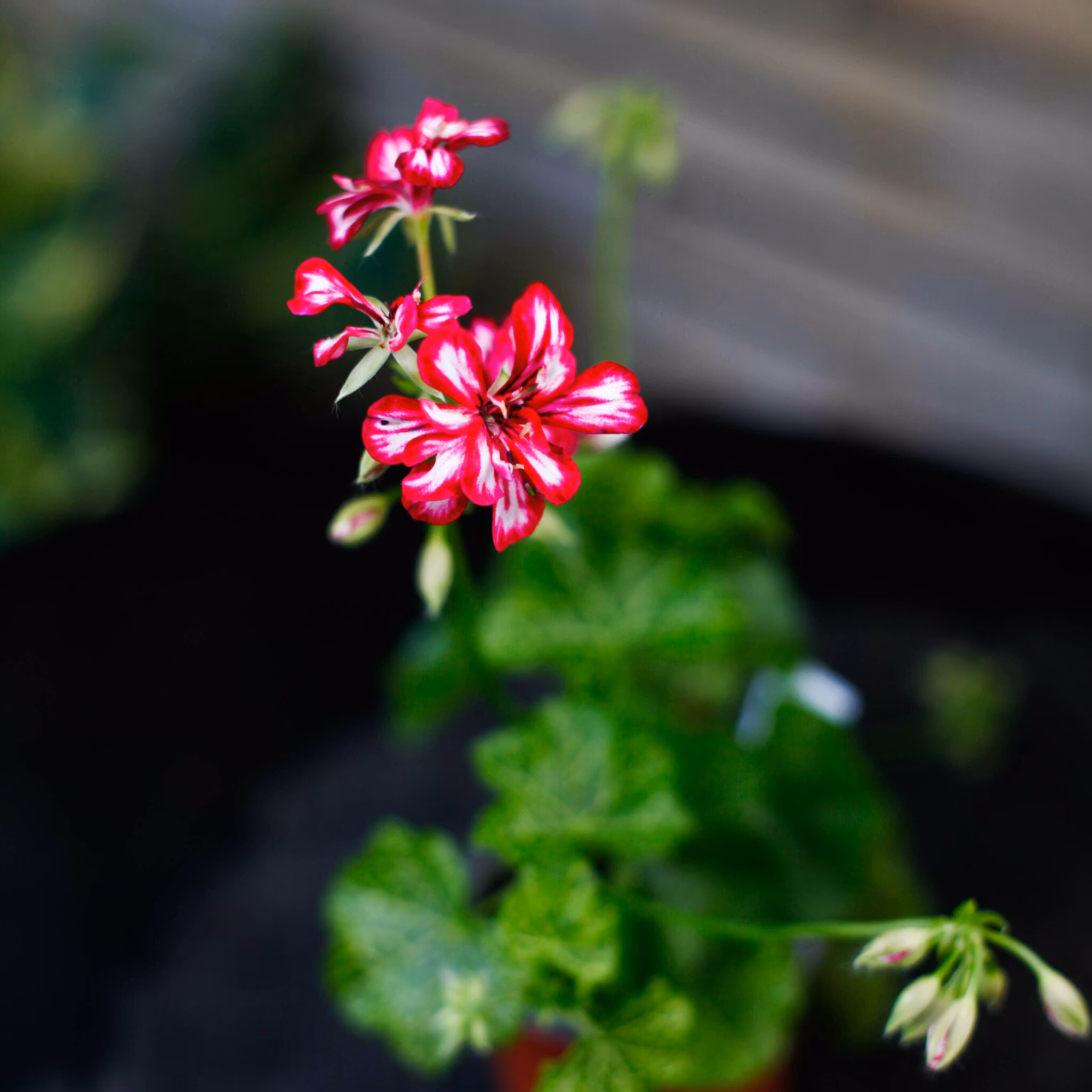 Pelargonium 'Crocetta' - En charmig hängpelargon med cerise och vita blommor. Perfekt för soliga balkonger och fönsterkarmar. Lättskött och långblommande.